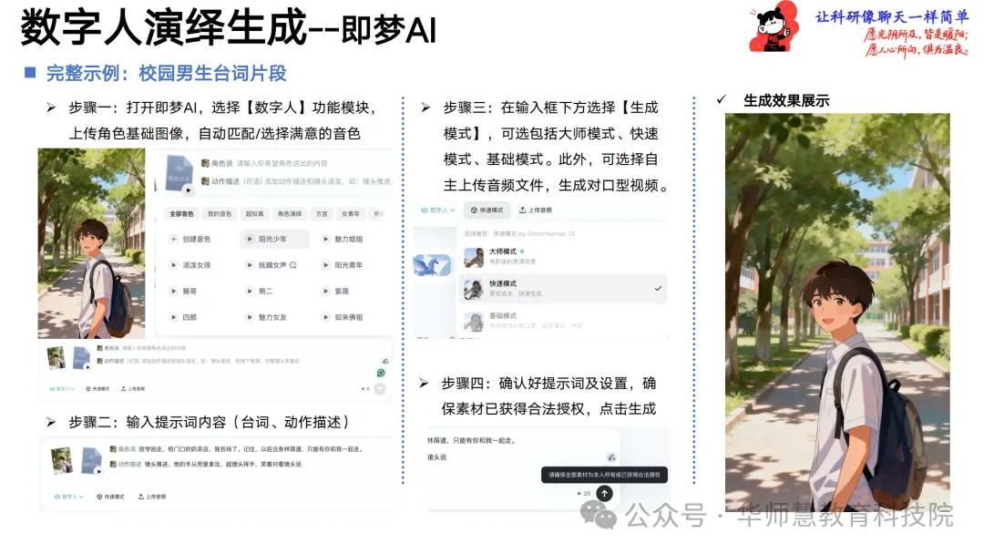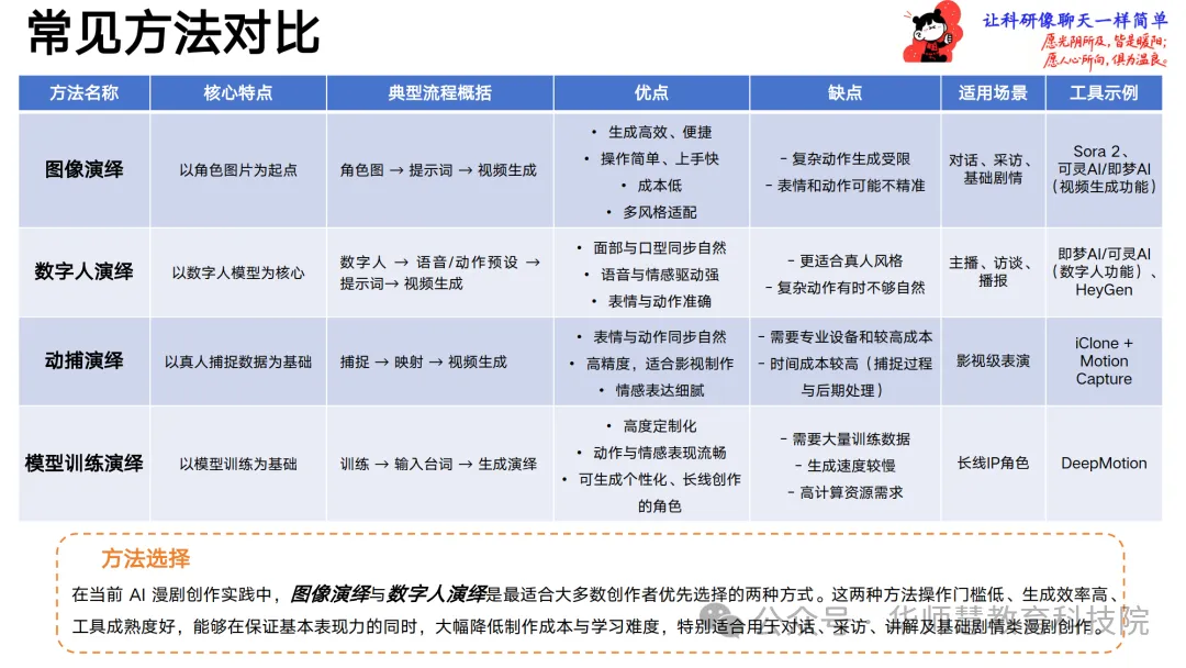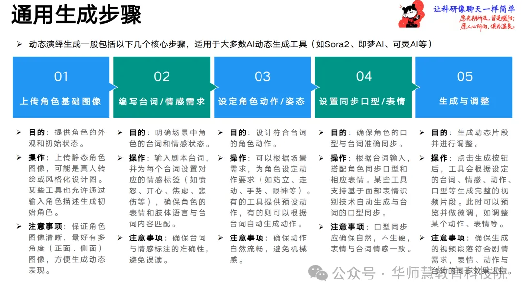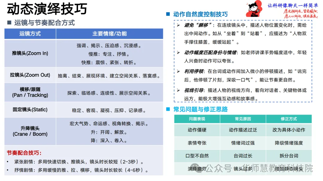 动态演绎部分对比图像演绎、数字人演绎、动捕演绎与模型训练演绎四类方法的优劣,聚焦低门槛的图像与数字人方案,详解从上传角色图、编写台词与情感、设定动作姿态到生成与调整的通用步骤,并归纳运镜与节奏配合技巧及常见问题修正思路,辅以Sora 2与即梦AI的完整案例演示。剧情创意设计章节引导创作者将零散构思转化为可执行的结构化文本,提供单点表达型、问答访谈型、冲突反转型等结构模板与AI提示词公式,覆盖剧情概述、单元大纲、关键情节点分布、情绪曲线与可视化建议,助力快速搭建故事骨架。创意呈现设计进一步拆解关键剧情节点的核心要素,匹配镜头创意、特效创意、角色变身、场景穿越、情绪渲染等AI可实现手法,并给出“采访变身”“奔跑穿场景”等可直接套用的案例。