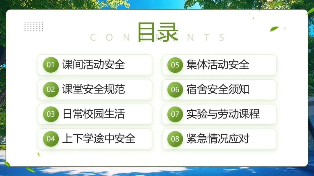 新学期伊始,除了开学安全教育以外,许多老师需要结合校园日常生活中的点点滴滴,给孩子们做好校园日常安全教育。今天就是应大家的需要,给大家带来校园日常安全教育全PPT,从课堂、课间、上下学、日常校园生活等8个方面展示,有需要的老师们可以参考借鉴!校园日常安全教育全PPT的获取方式如下: