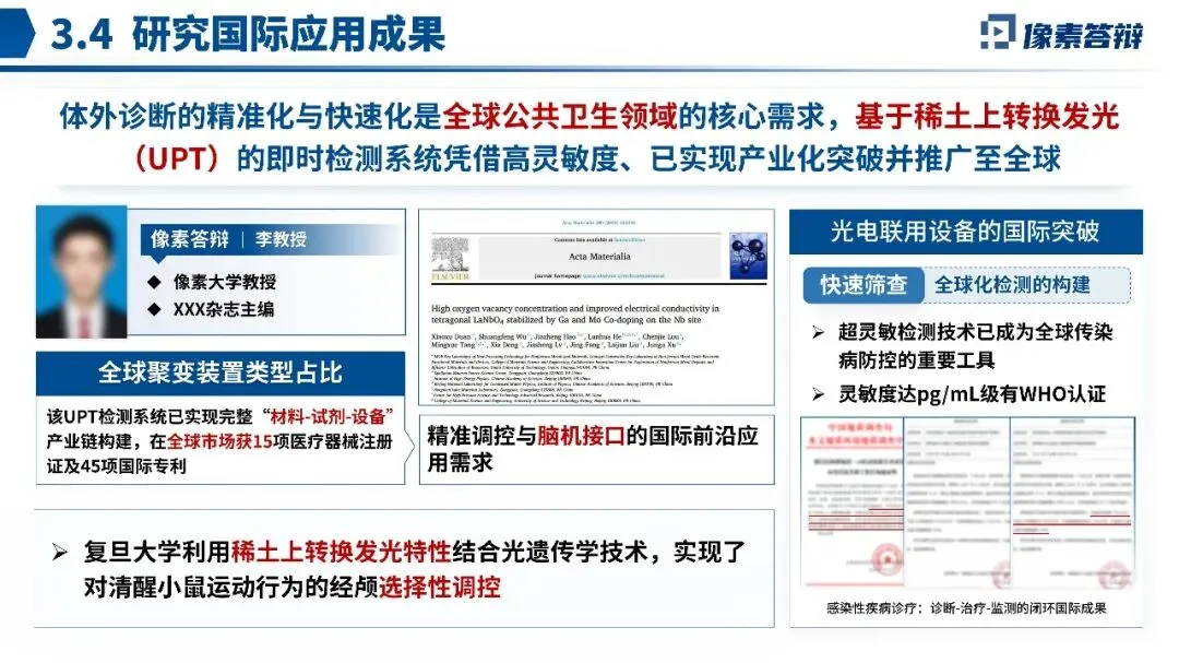 三是创新成链,从材料到应用。 通过核-壳结构设计提升发光效率,解决“看得深”;构建诊疗一体化平台实现“看得准”;拓展体外诊断与活体治疗场景,形成“诊断-治疗-监测”闭环。成果已获WHO认证及15项国际医疗器械注册证,证明其产业化潜力。