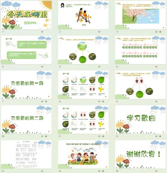 2.师:黄鹂鸟的歌声小红书原创作者:布布可可好听了,它们看到春天里美丽的景色,高兴地唱起了歌,让我们一起来听听吧!(播放完整版音乐)