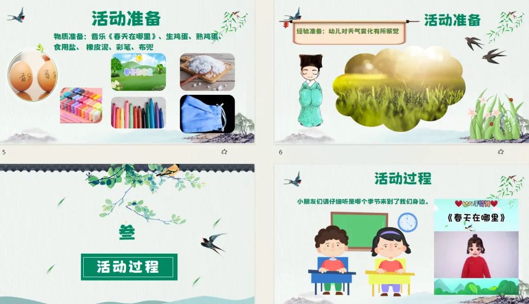 物质准备:音乐《春天在哪里》、生鸡蛋、熟鸡蛋、食用盐、 橡皮泥、彩笔、布兜、相关PPT