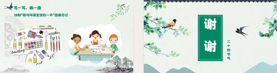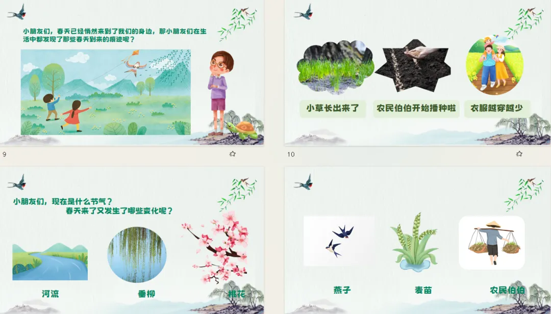 幼:河水融化,垂柳发芽,桃花开花,燕子回来,麦苗长新芽,农民伯伯开始劳作。(鼓励幼儿大胆表达对画面的观察和理解,教师运用恰当的语言总结幼儿的回答)
