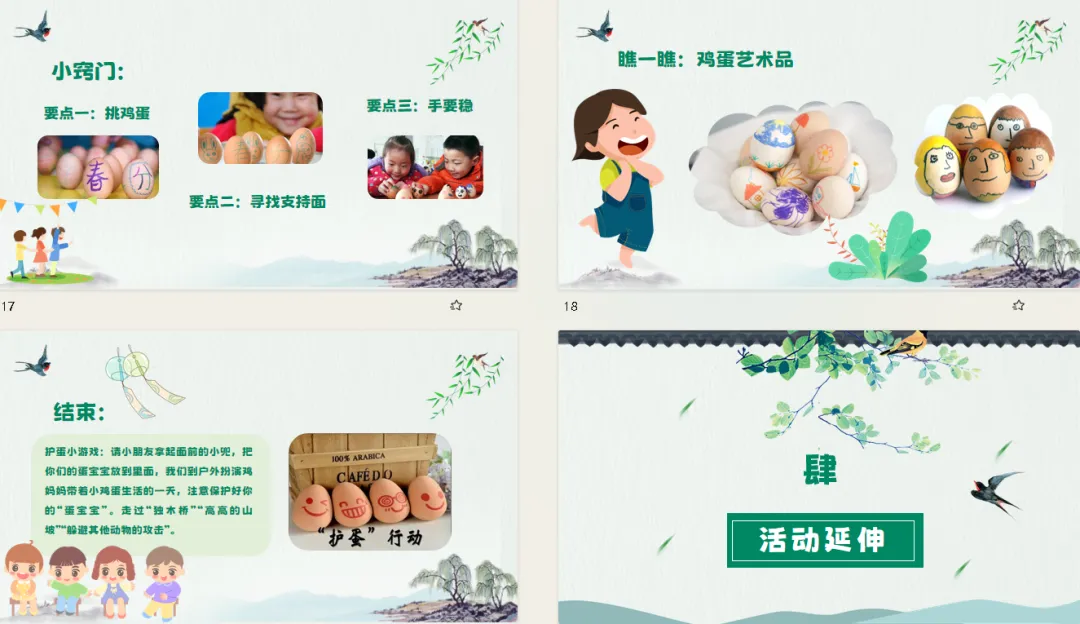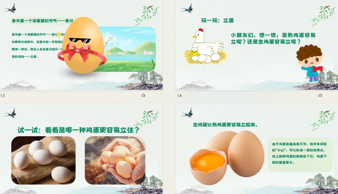 师:今天同样也是春天里一个很重要的节气——春分。把白天和黑夜分成两半,在春分这一天则是白天和黑夜一样长。而古人会在春分进行一项有意思的活动——立蛋。老师也给大家准备了一些道具,接下来请小朋友们猜一猜立蛋到底是熟鸡蛋更容易立起来还是生鸡蛋更容易?