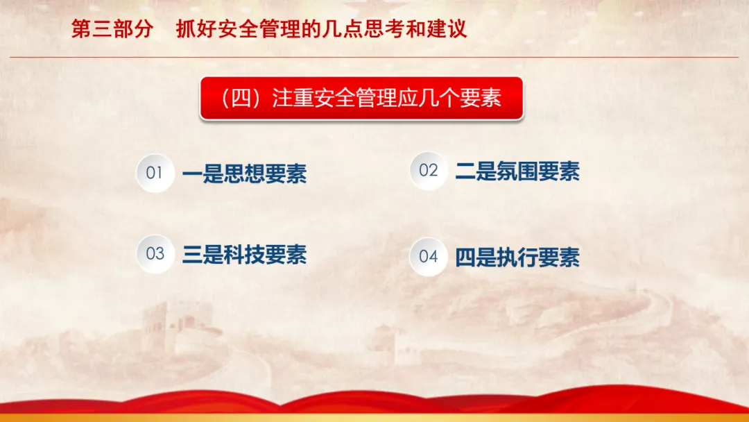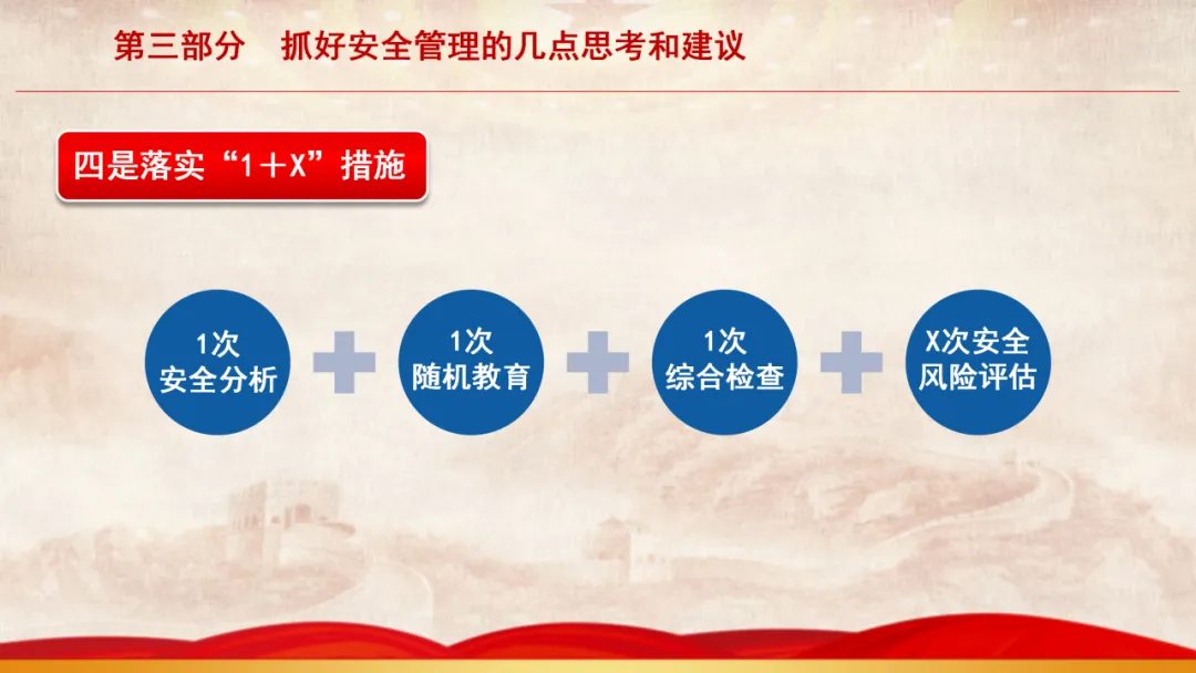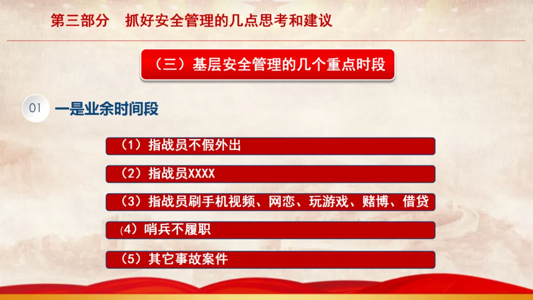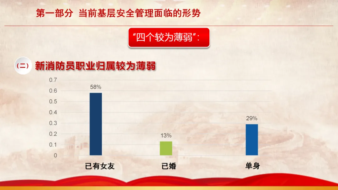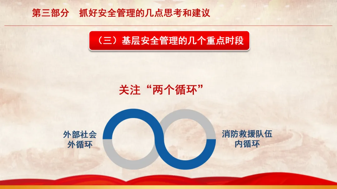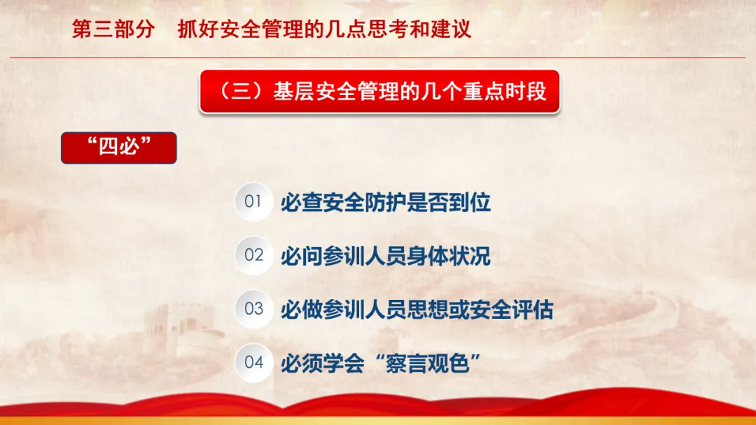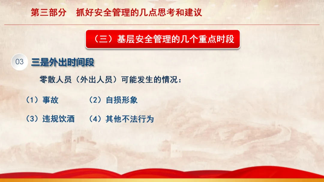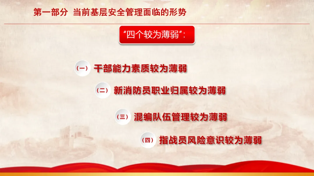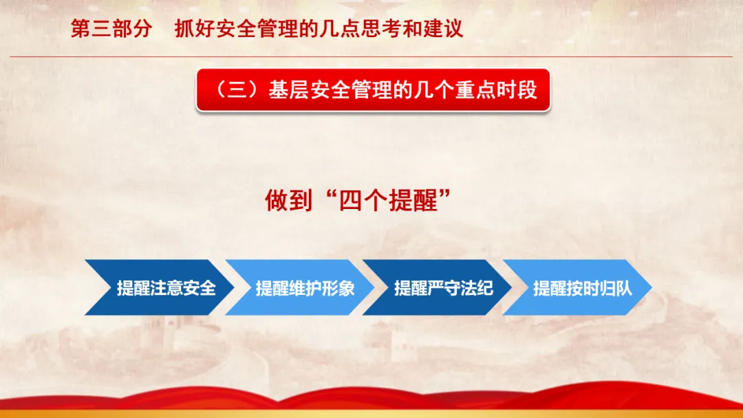 主旨内容:该课件围绕基层安全管理展开,先阐述当前面临的形势,指出存在干部能力素质、新消防员职业归属等“四个较为薄弱”问题。接着剖析基层安全管理在层级管理、制度执行、日常管教方面的不足。最后从消除认识缺失、完善管理架构、聚焦重点时段、注重关键要素等方面,提出抓好基层安全管理的思考与建议,以夯实队伍发展根基。