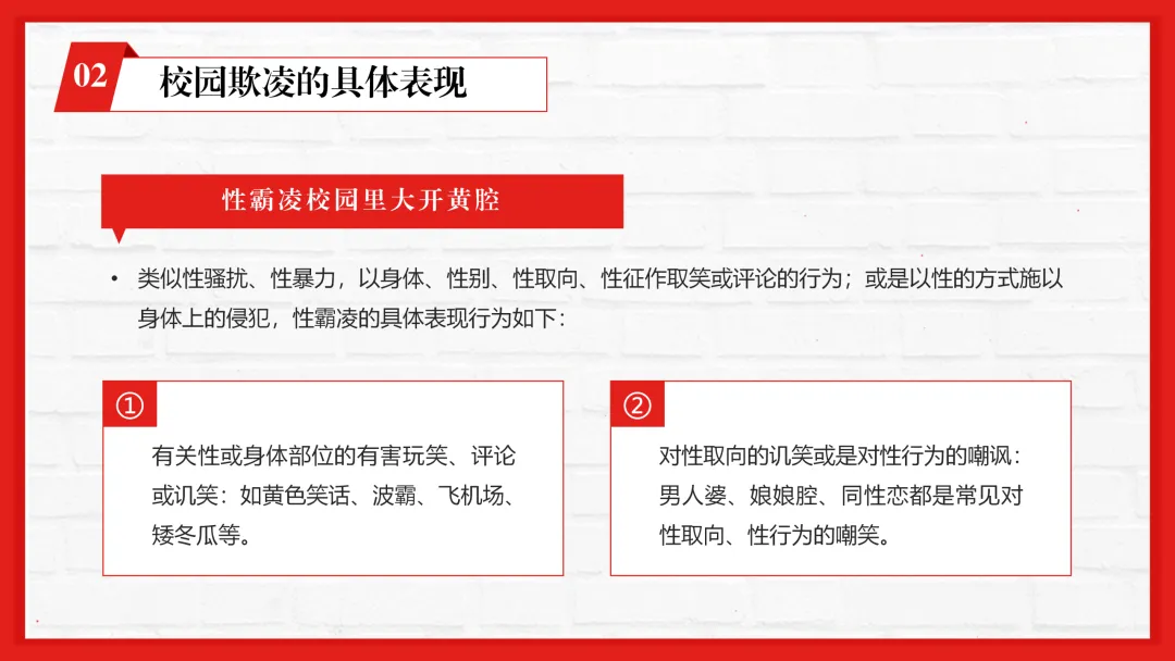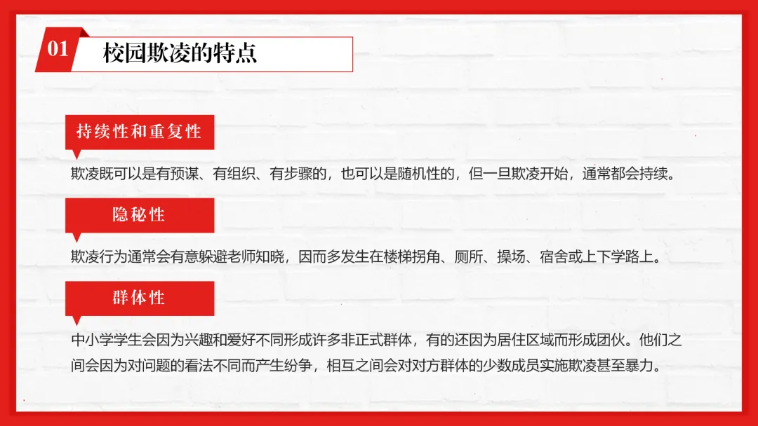 ppt从什么是校园欺凌入手,明确语言、身体、网络等六大欺凌类型及持续性、隐秘性等特点,再拆解关系、言语、肢体等具体欺凌表现,接着分析欺凌对被欺凌者、欺凌者、旁观者的多重危害