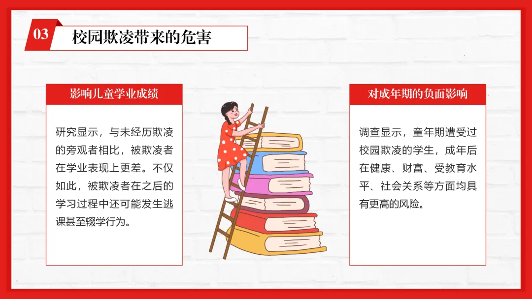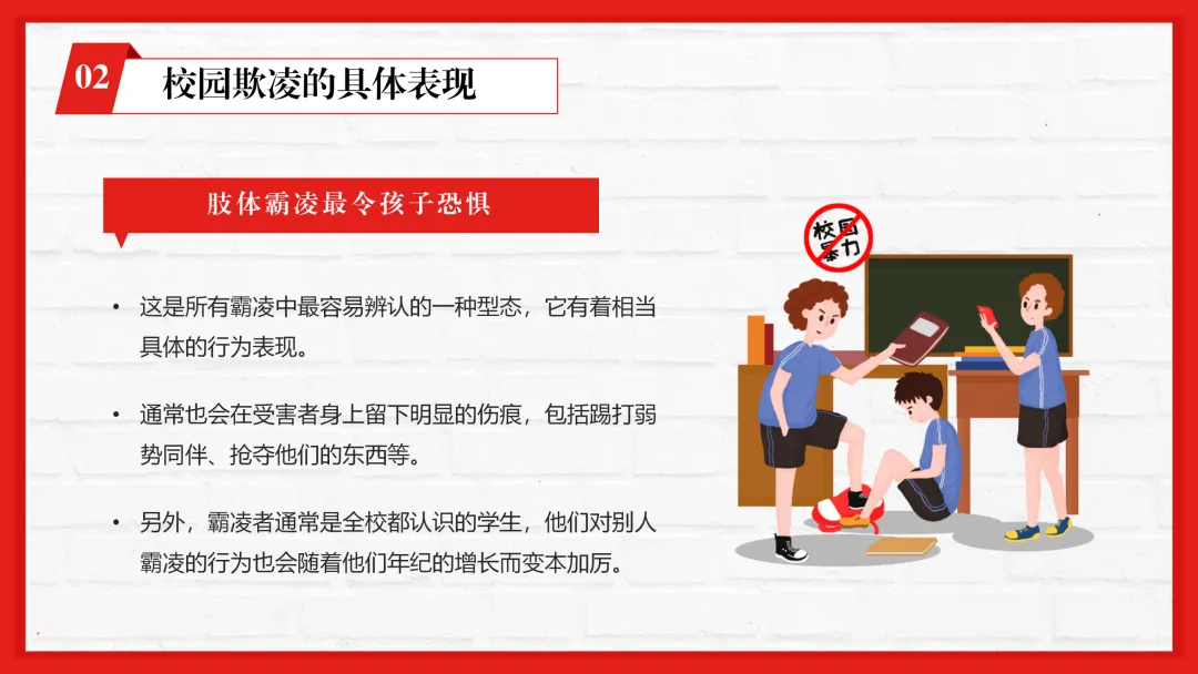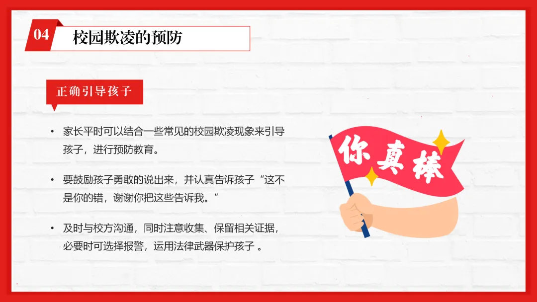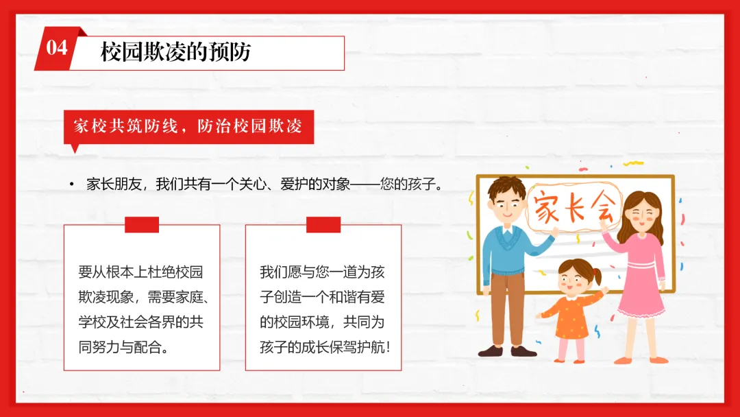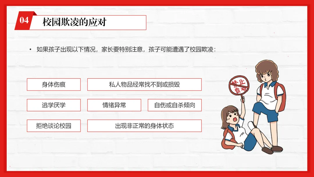 ppt内容贴合一线教学,不仅有专业的校园欺凌知识讲解,还加入了孩子遭遇欺凌的信号识别、家长和老师的应对技巧等实用内容,图文搭配适配课堂展示。
