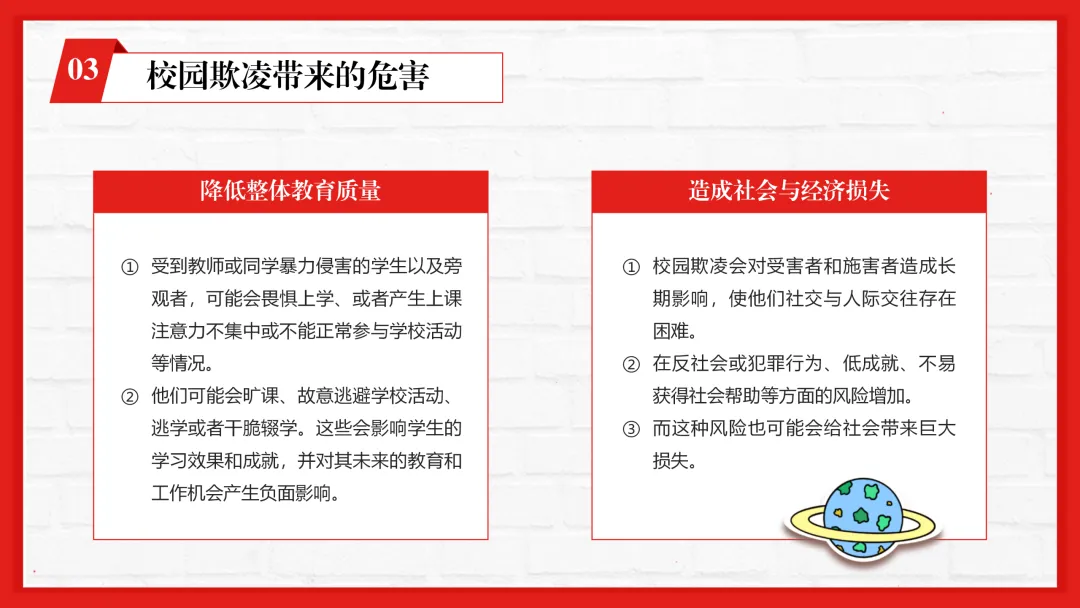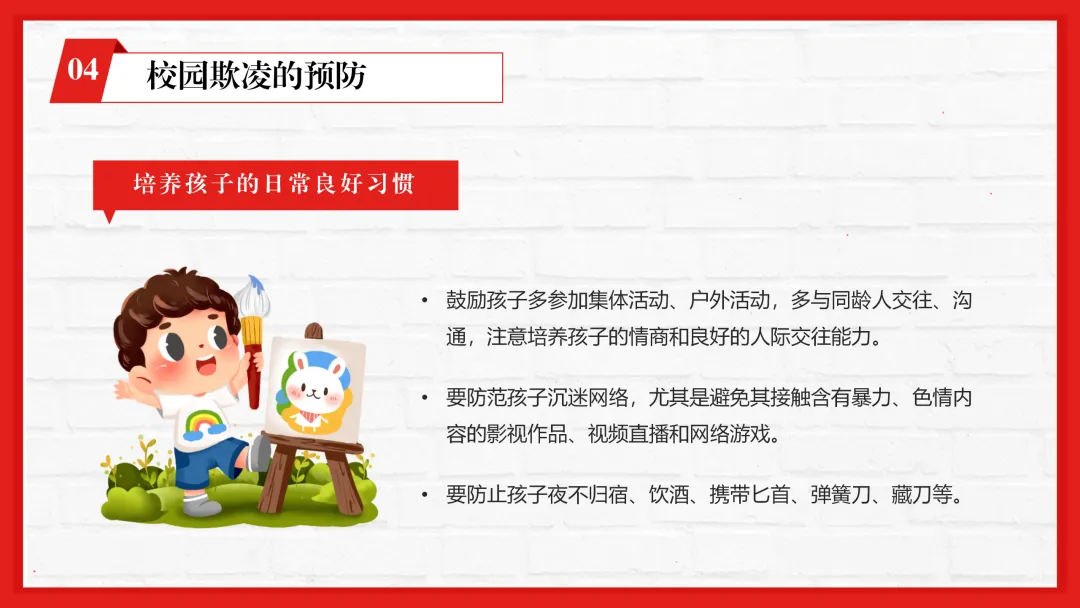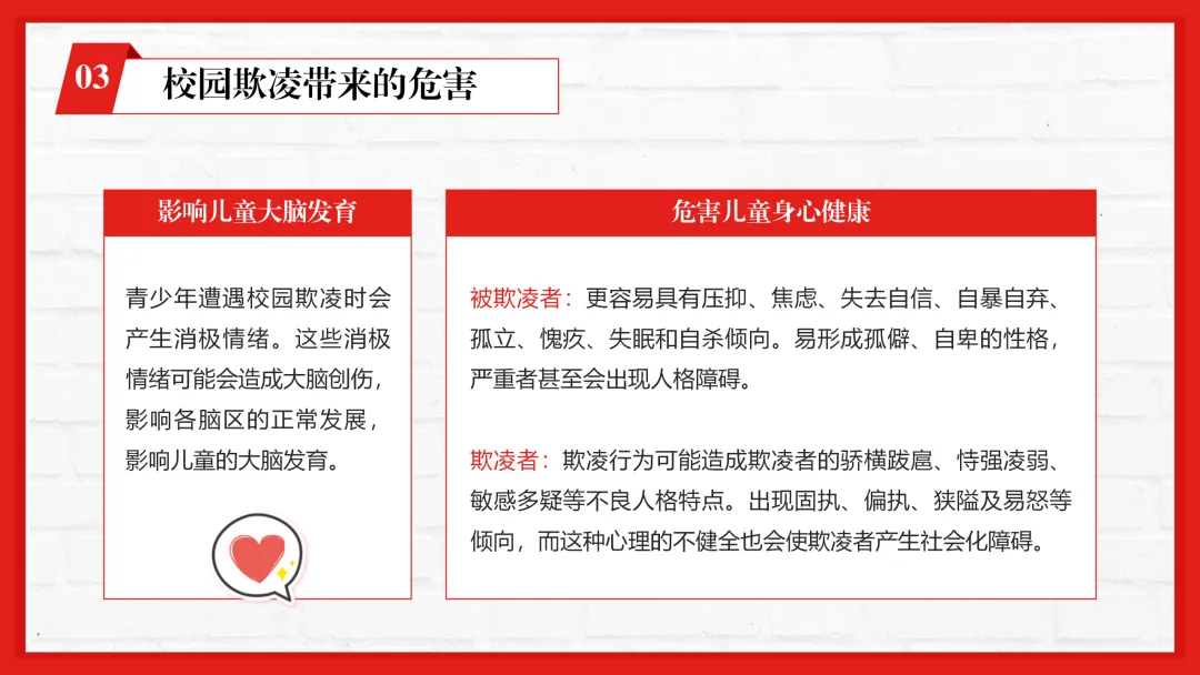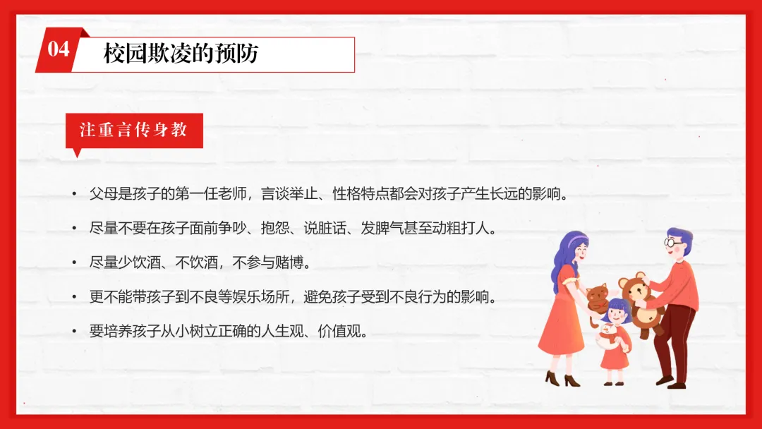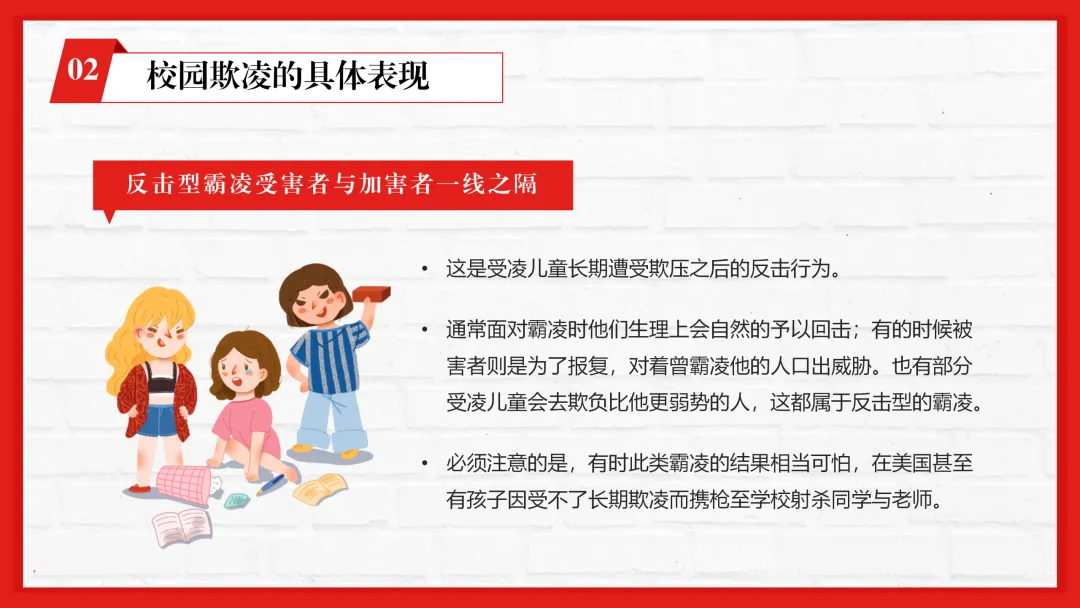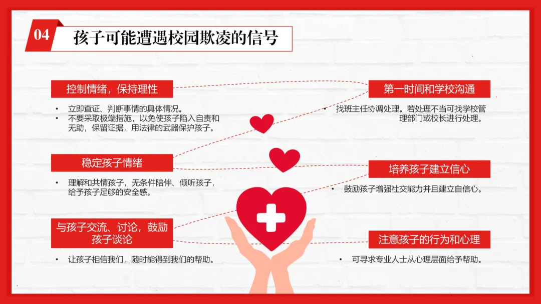 ppt内容贴合一线教学,不仅有专业的校园欺凌知识讲解,还加入了孩子遭遇欺凌的信号识别、家长和老师的应对技巧等实用内容,图文搭配适配课堂展示。