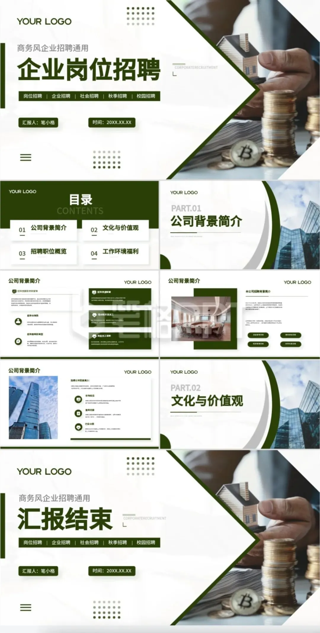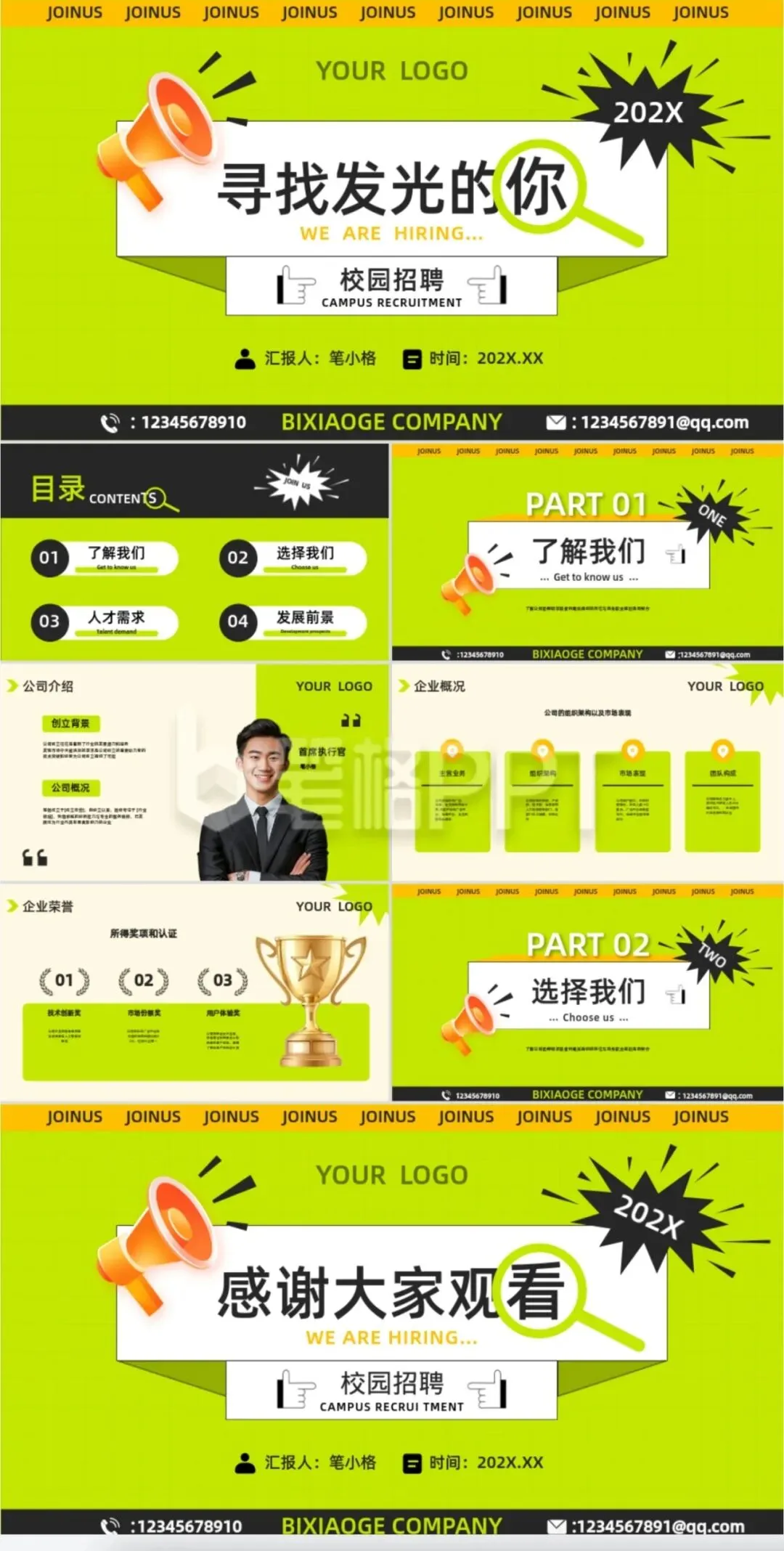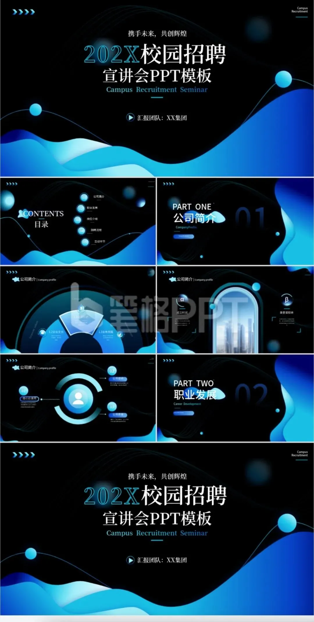 此外,这组模板版式自由、重点突出,让企业宣传在一众PPT中脱颖而出,吸引求职者的关注。