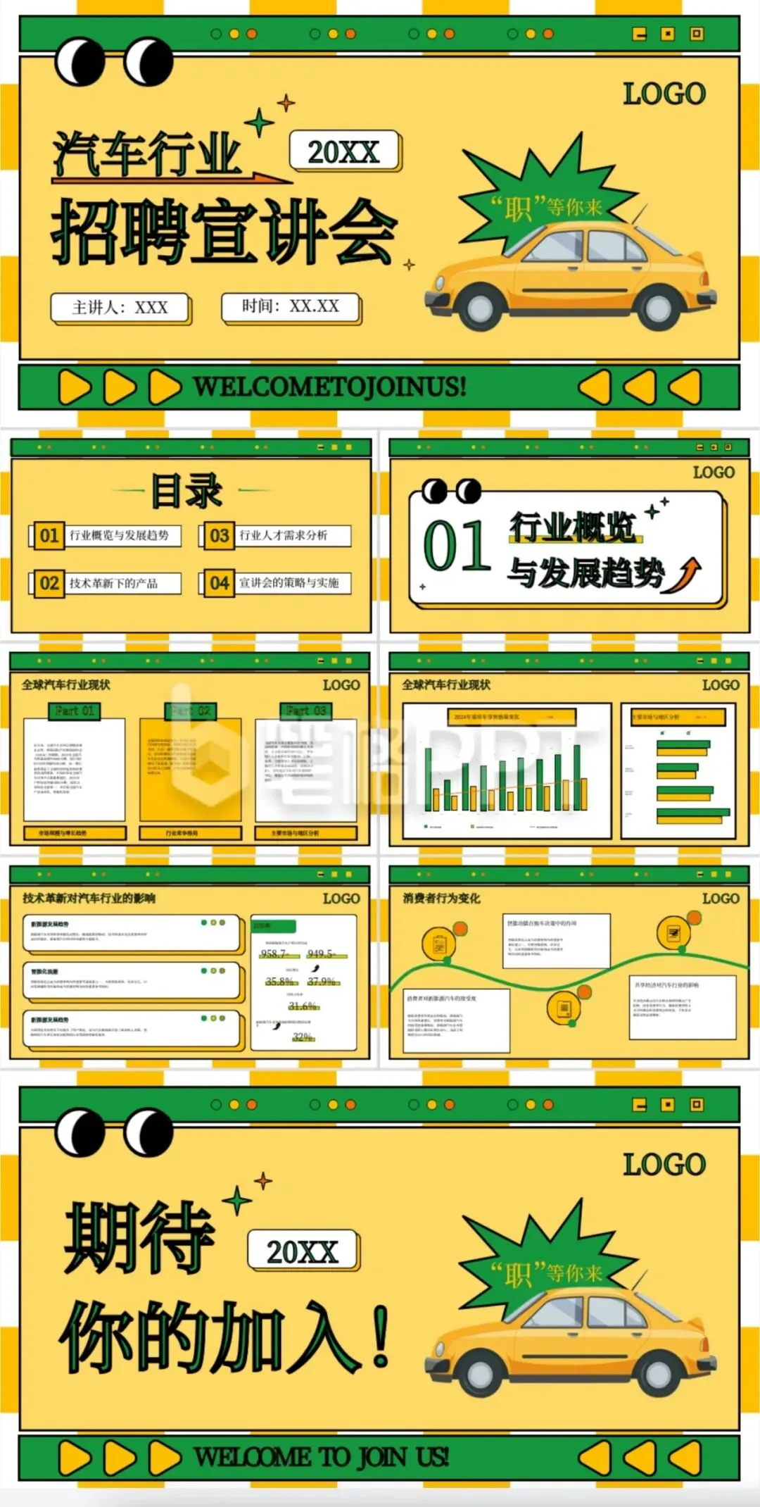 这组春季招聘PPT模板,以亮黄、草绿为主色调,融入卡通汽车、喇叭、放大镜等元素。