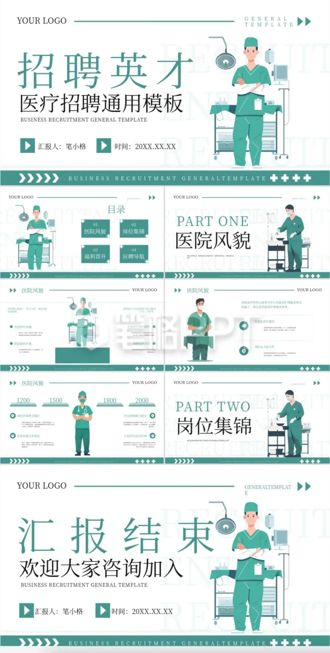 这组春季招聘PPT模板,在配色上以浅绿、浅蓝为主色调,融入医护插画、扁平互联网元素。