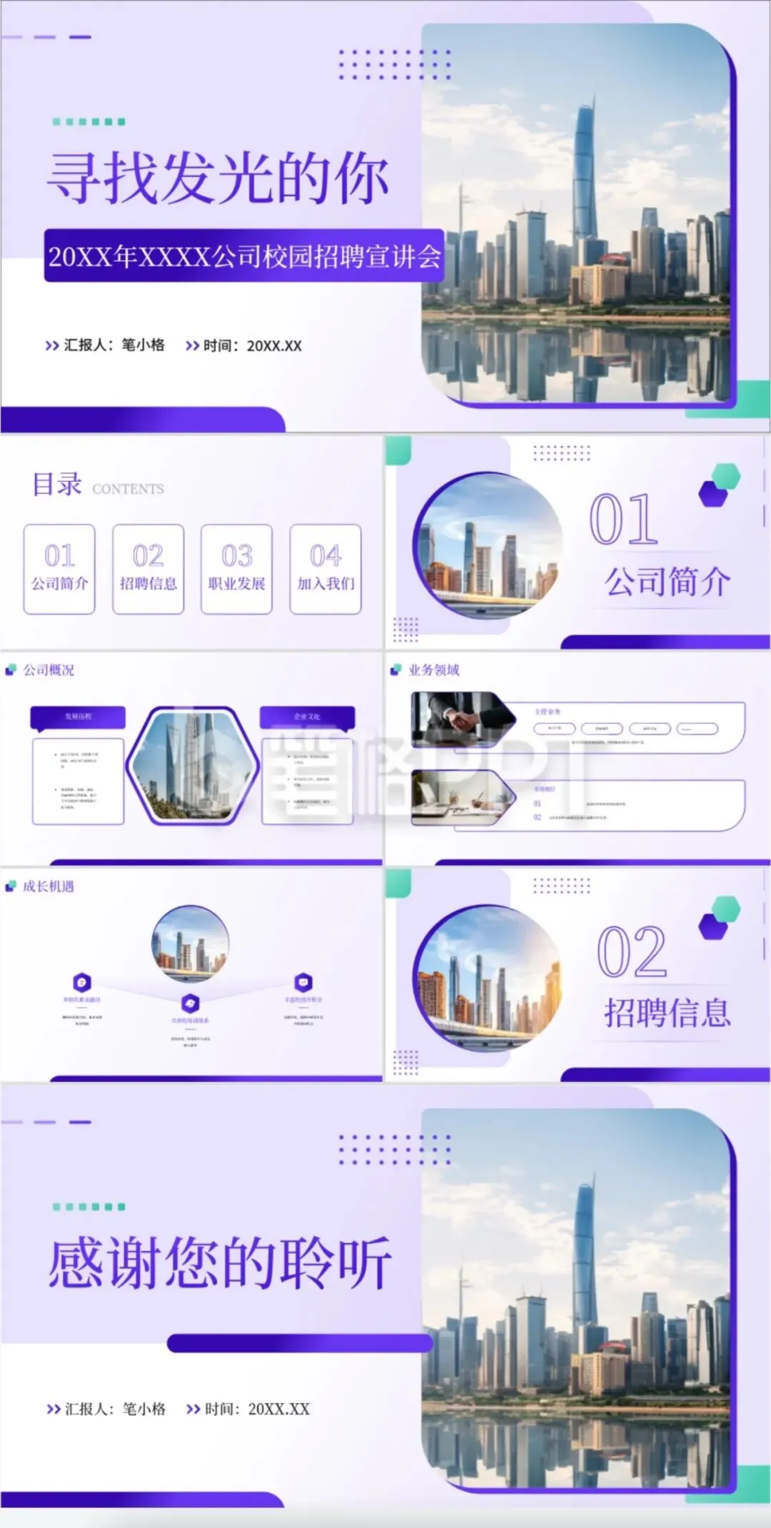 这组春季招聘PPT模板,以浅紫、白为基底,搭配城市剪影、科技图表等现代元素,整体风格简约大气。
