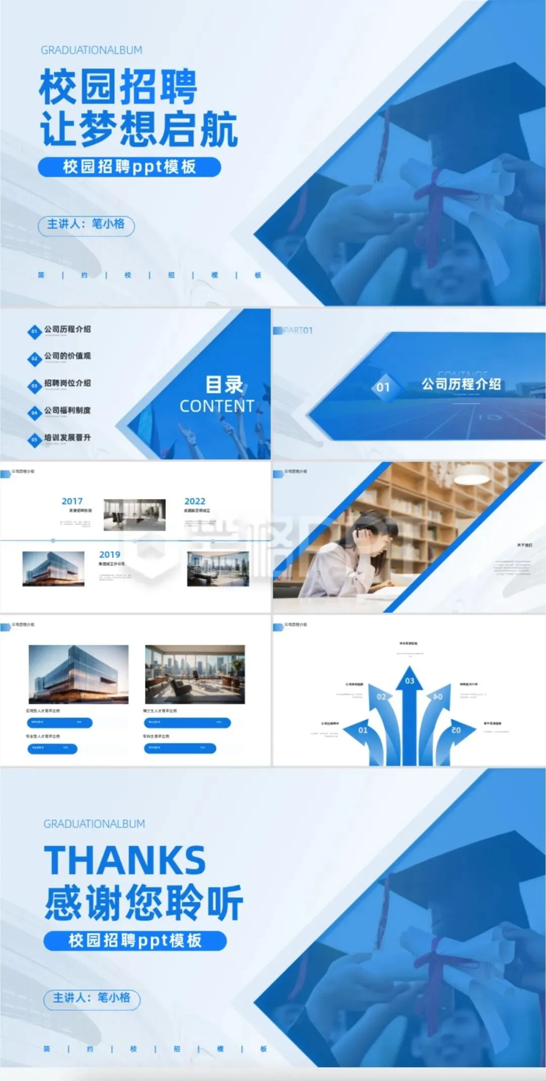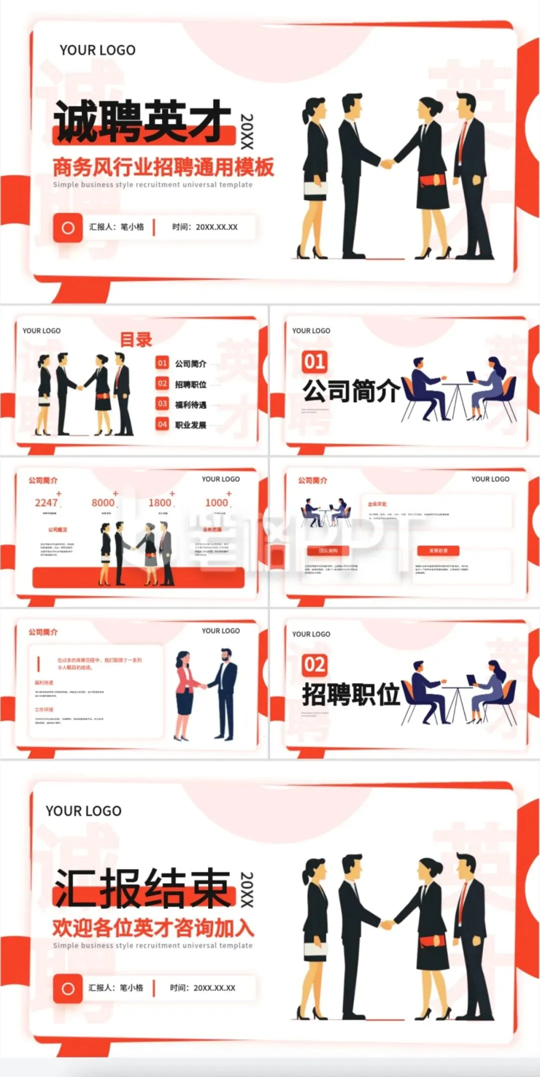 这组春季招聘PPT模板,采用红白、蓝白为主色调,融入商务场景、毕业元素,强化招聘季主题。
