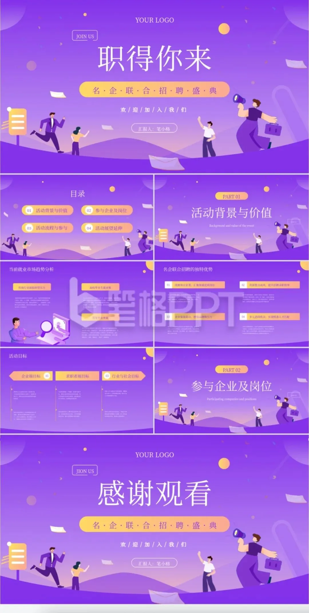 这组春季招聘PPT模板,以白绿、紫橙为主色调,融入金融元素、职场人物等,突出招聘主题。