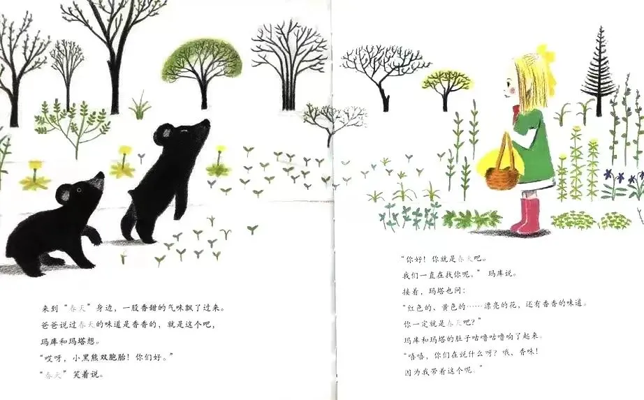 “哎呀,小黑熊双胞胎!你们好。”“春天”笑着说。
