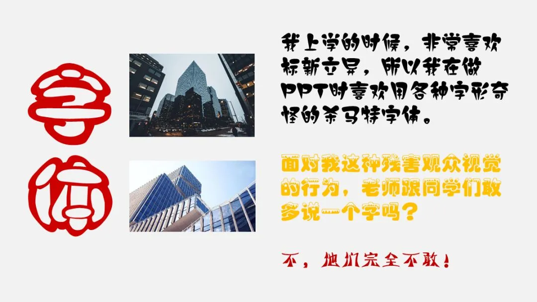 比如,简单一段话,有了高端配图的加持,这页 PPT 的设计费能从五毛涨到两百:又比如,同样的一张 PPT,不同的配图,带给人的感觉也会不一样:所以说,如果有时候你觉得 PPT 里充满了洗剪吹的味道,那可能不是你 PPT 的排版有问题,而是图片出卖了你发廊总监 Tony 的身份…这里推荐两个去处,一是图片网站 Unsplash:二是 PPT 插件【iSlide】里的【图片库】:这两个渠道的图片资源不仅质量高,而且都是免费可商用的!仔细观察那些有高级感的 PPT,无论是中文还是英文,你会发现它们极少会使用下面这类花里胡哨的字体:比如英文里的 Helvetica、Didot 系列字体,中文里的微软雅黑,或是经过现代改造的思源宋体系列等等:经典之所以能成为经典,自有它的道理,所以当你不知道该在 PPT 中使用什么字体时,用这些经典的字体总不会错。因为字体种类过多的话,PPT 就容易出现杂乱的效果,土味发廊的气息这时很容易死灰复燃: