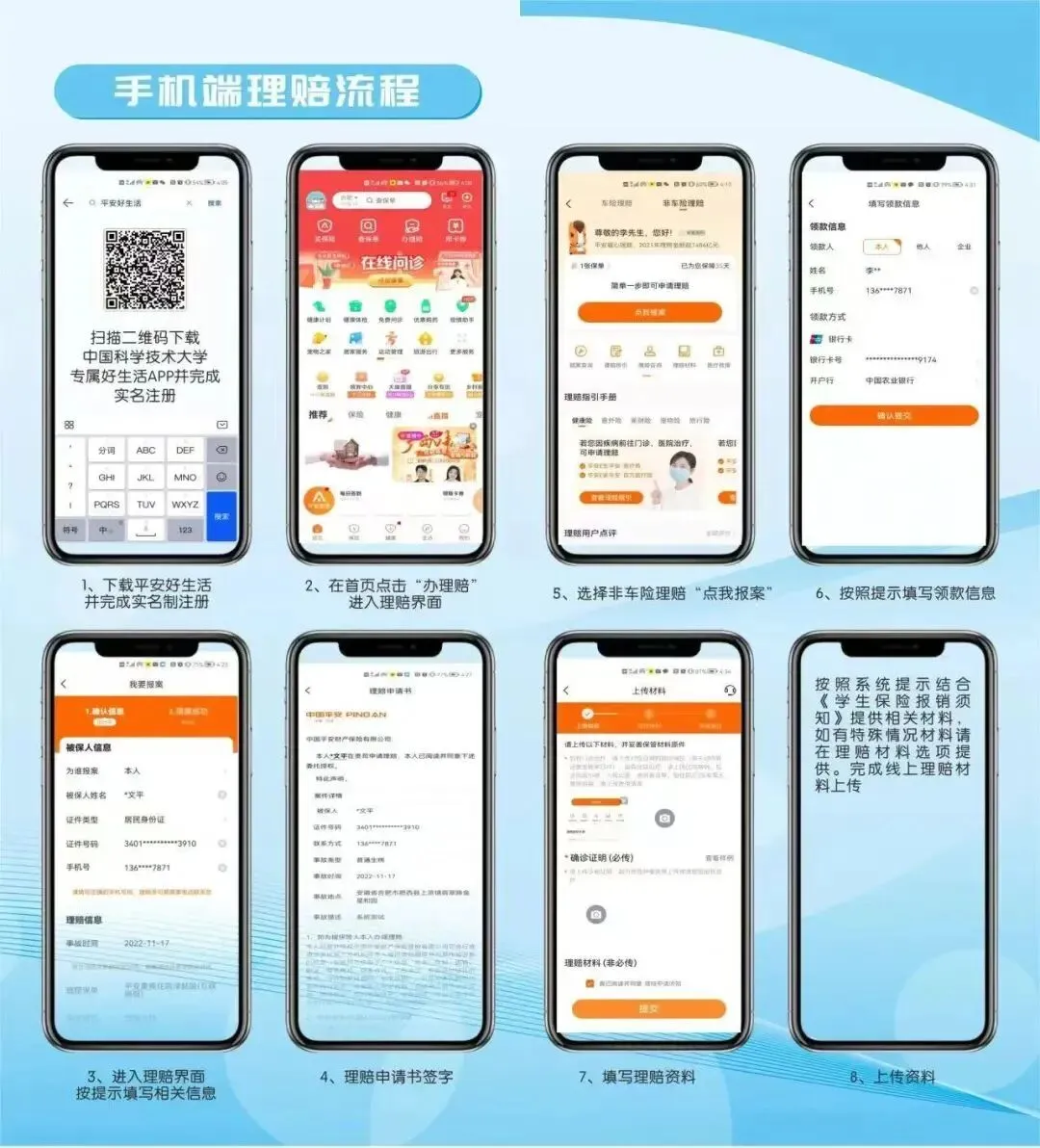 为向科大学生提供便捷的理赔服务,我方将定期安排公司理赔人员至科大东、西、高新三个校区校医院一楼现场收取理赔资料,同时在事实清楚、材料齐备的前提下,经双方协商在5个工作日内完成理赔。分别是每月的每周六上午9:30--12:30(寒暑假和国家法定节假日除外)