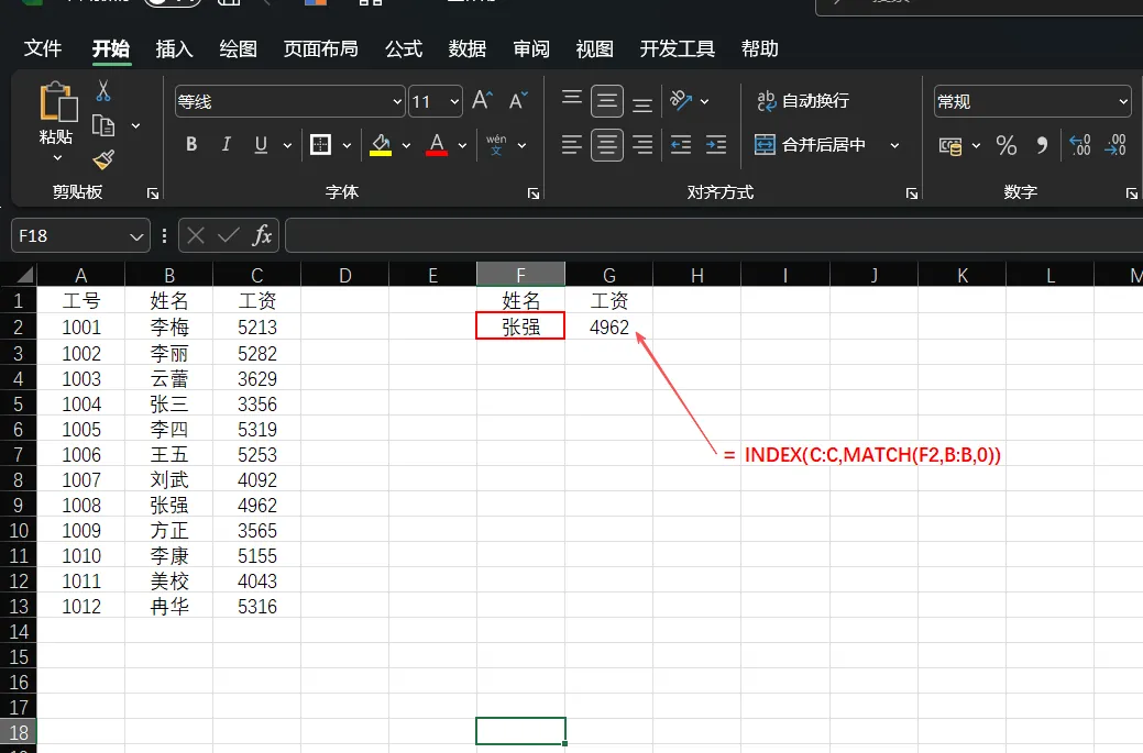 场景:同样是员工信息表,A列是姓名,C列是工资。现在你知道某人的工资是8000元(在F2单元格),想反查出他的姓名。