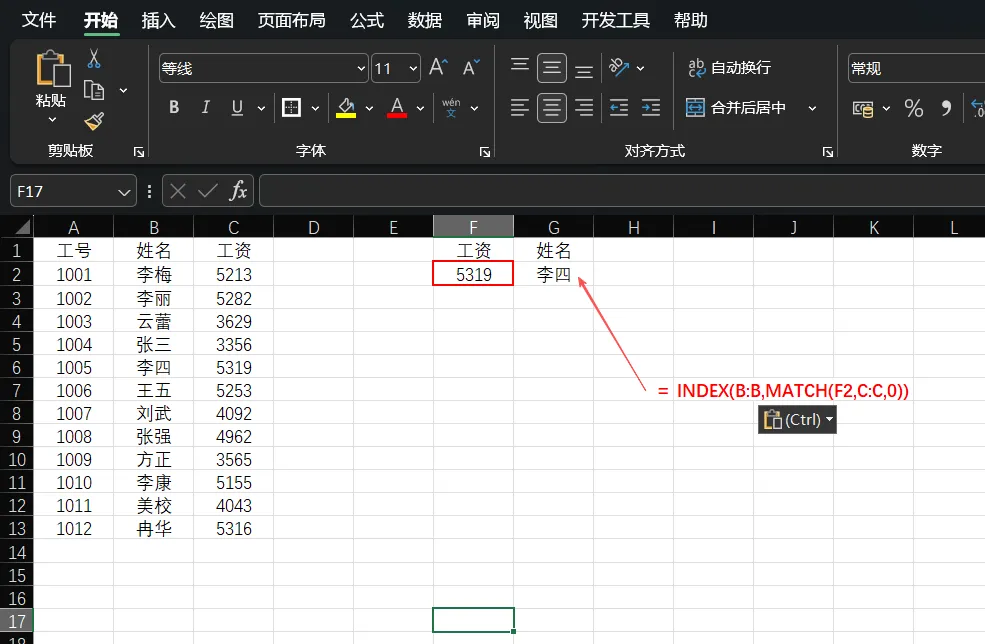 1. 分析逻辑:这次,我们要在C列(工资列)中找到5319元的位置,然后去B列(姓名列)的同一位置提取姓名。