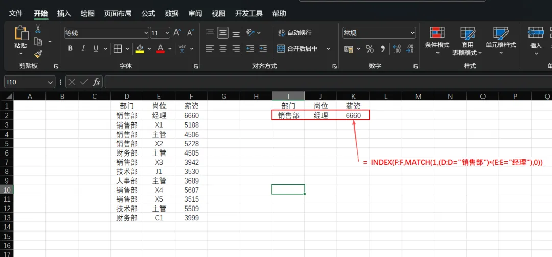 场景:表格中D列是部门,E列是岗位,F列是薪资。现在需要查找“销售部”的“经理”的薪资是多少。