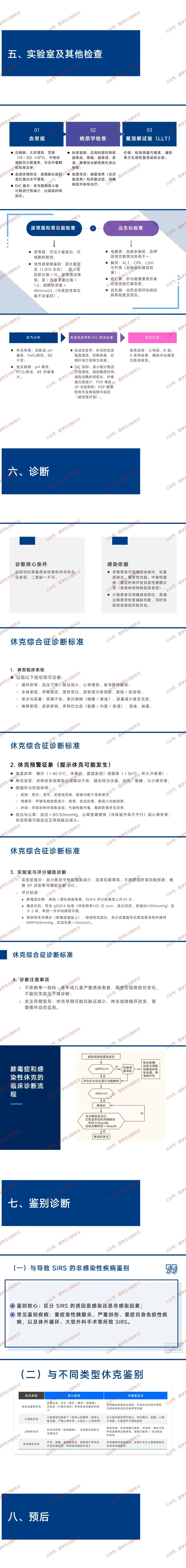 诊断标准(满足≥2 项):体温>38℃或<36℃;心率>90 次 /min;呼吸>20 次 /min 或 PaCO₂<32mmHg;白细胞>12×10⁹/L 或<4×10⁹/L,或未成熟中性粒细胞>10%。