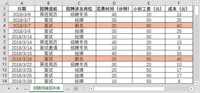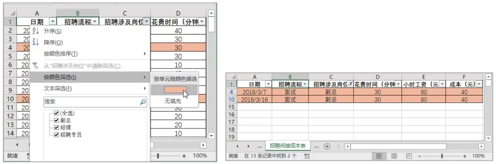如果要将下图中是“副总”面试的招聘记录筛选出来,就可以按颜色进行筛选。