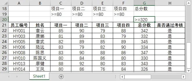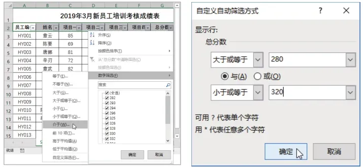 例如,筛选出员工培训考核成绩总分数在 280~320 这个区间的数据,具体操作步骤如下。