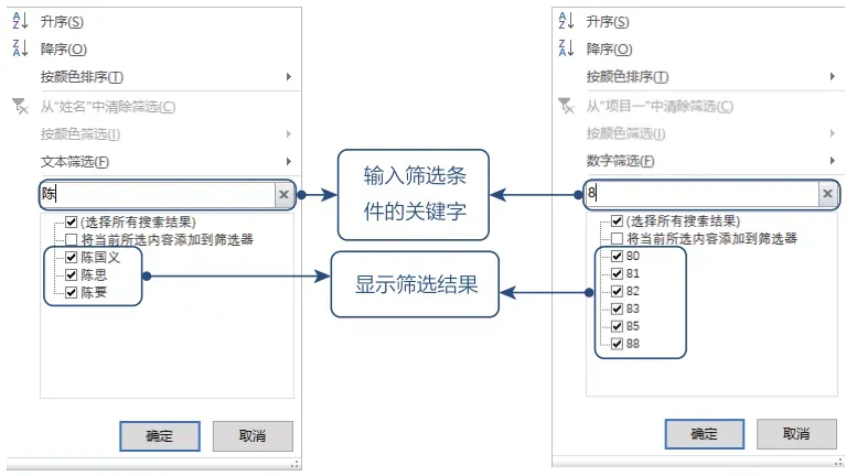 例如,左下图所示为在“姓名”字段的筛选搜索框中输入关键字“陈”,所筛选出来的数据;右下图所示为在“项目一”字段的筛选搜索框中输入关键字“8”,所筛选出来的数据。当需要筛选出以某值开头或结尾的数据及固定位数的数据时,则需要通过通配符星号(*)和问号(?)进行模糊条件筛选。