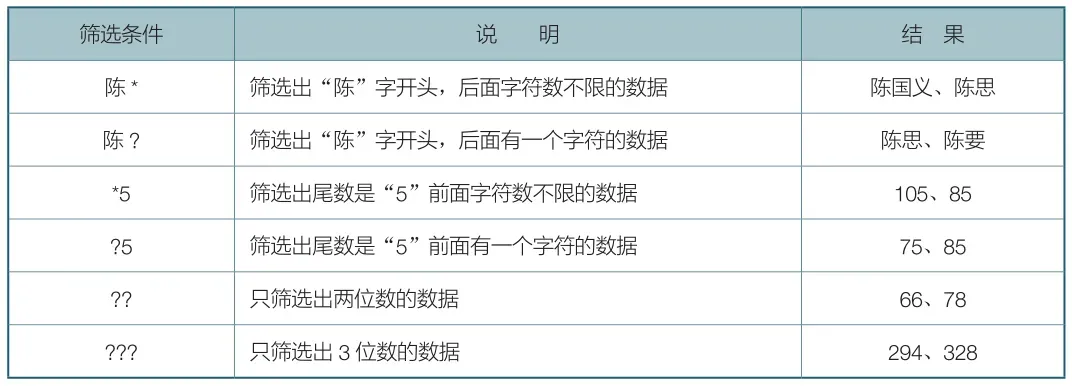 使用模糊筛选时,只需要在筛选搜索文本框中使用通配符加搜索目标值,就可以快速筛选出开头或结尾包含某值的数据,如下表所示。高级筛选不仅包含了自动筛选的所有功能,而且还可以完成比较复杂的多条件筛选,并可以把筛选结果复制到其他区域或表格中。