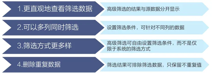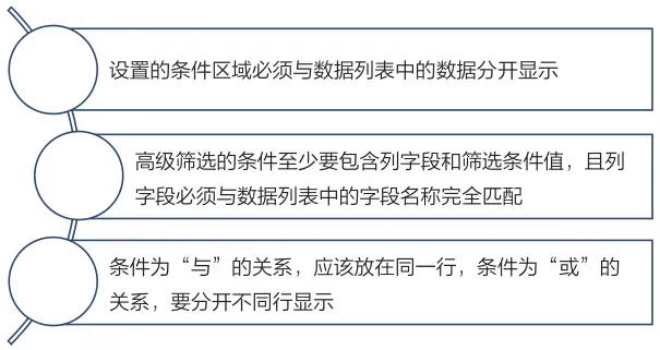 相对于自动筛选而言,高级筛选的好处有 4 点,如下图所示。高级筛选与自动筛选不同,它需要单独设置筛选条件区域,并且对条件区域的设置还有一定的要求,具体要求主要有如下图所示的几点。