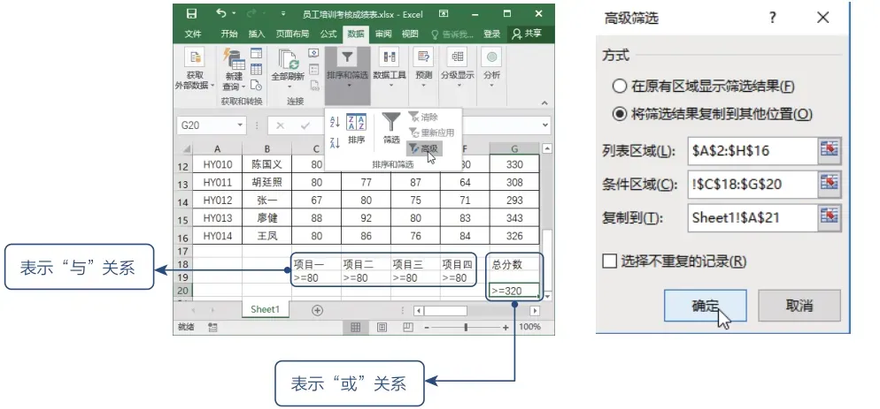 例如,使用 Excel 高级筛选功能筛选出 4 个项目的成绩均大于等于 80,或者总分数大于等于 320,并将筛选结果放置到其他区域中,具体操作步骤如下。在工作表 C18:G20 单元格区域中输入筛选条件,单击【排序和筛选】组中的【高级】按钮,如左下图所示。