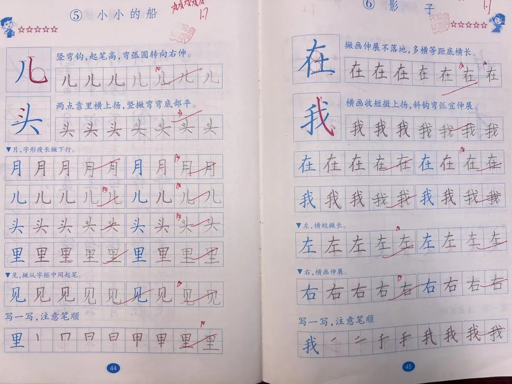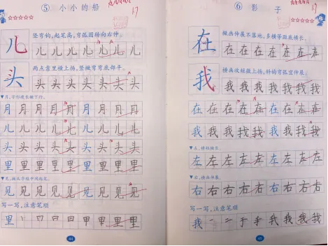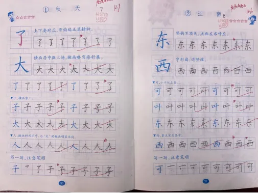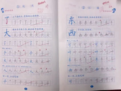 我们有一本配套“习字册”(教材配发),我一个字都没教,但90%的学生都写得很工整、漂亮,即使从来没有练过字的小秋也能写到五颗星,因为我们充分用好了习课堂PPT中的“写字小视频”。