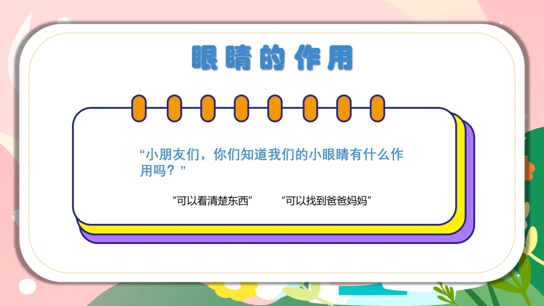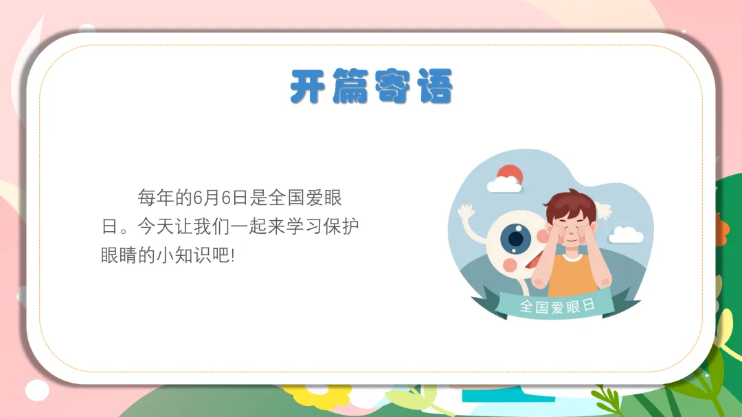 开篇先拉近距离,用温柔又有童趣的话开启护眼小课堂✨ 跟宝贝们说:“宝贝们,我们的眼睛是心灵的小窗户,能看到五颜六色的花朵、可爱的玩具,还能看到爸爸妈妈的笑脸~ 6月6日是全国爱眼日,今天我们就一起解锁保护小眼睛的小妙招,做守护眼睛的小卫士,好不好?” 简单几句话,既能勾起娃的兴趣,也能让娃初步了解爱眼日的意义。