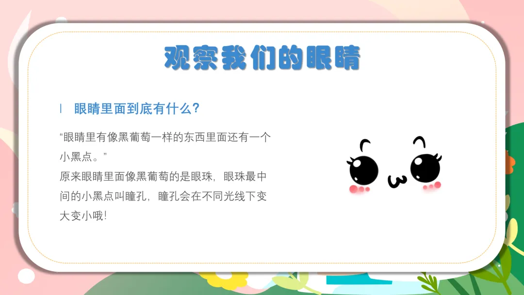 带着宝贝们观察自己的小眼睛,问问娃:“宝贝们,看看自己的小眼睛,里面有什么呀?” 引导娃发现眼珠、瞳孔,用通俗的话告诉宝贝们:“瞳孔就像小黑洞,亮的时候会变小,暗的时候会变大,是不是超神奇?”