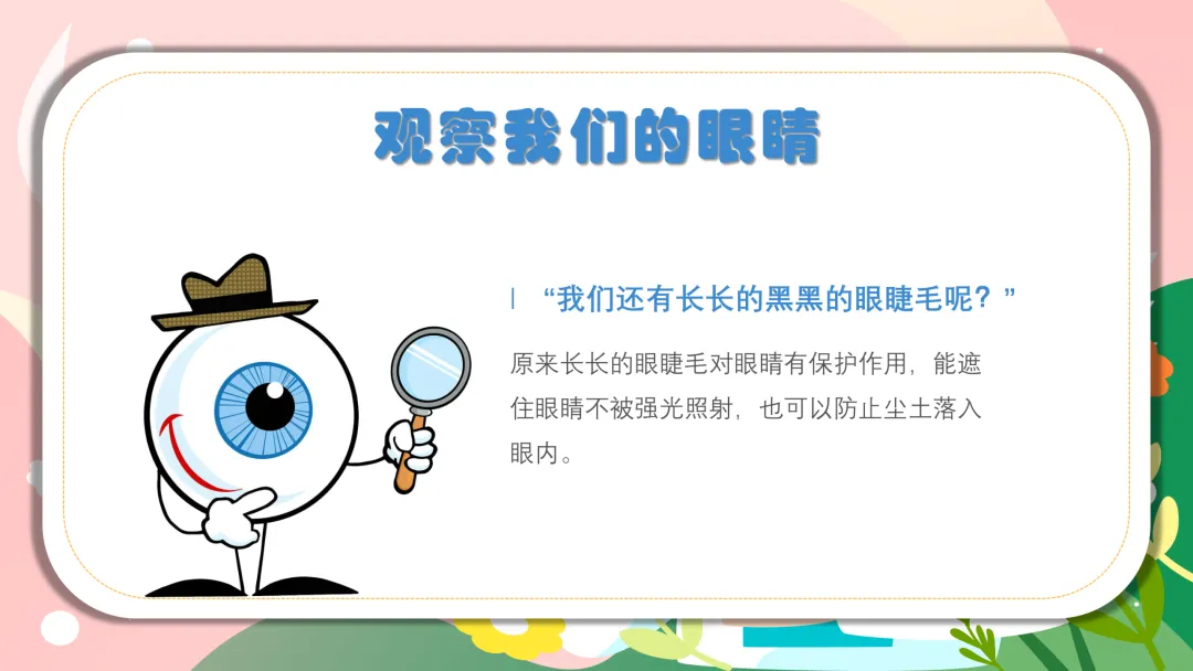 再聊聊眼睫毛的作用,告诉娃:“长长的眼睫毛是眼睛的小卫士,能挡住刺眼的阳光、飞进来的小灰尘,不让我们的小眼睛受伤害哦~” 最后和宝贝们互动,让娃说说“小眼睛能帮我们做什么?”,鼓励娃积极发言,比如“看绘本、找玩具、认小伙伴、看动画片”,让娃在互动中明白眼睛的重要性,从心里愿意保护它。