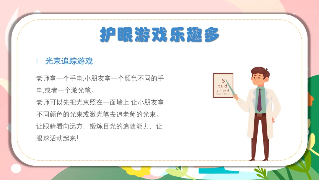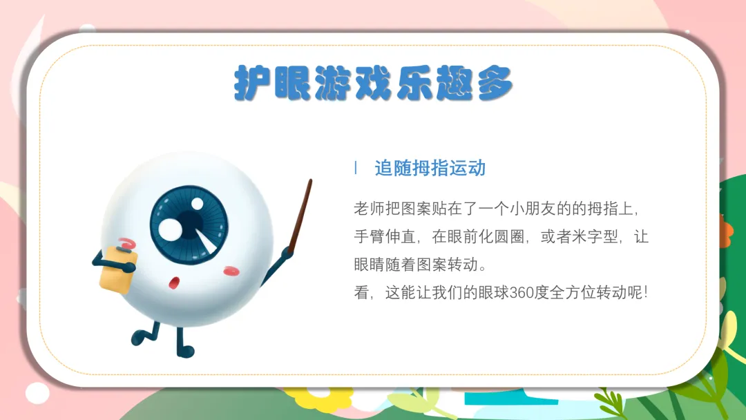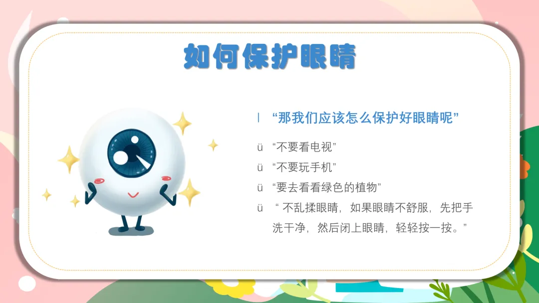 结合宝贝们的日常校园和家庭生活,用简单直白的话讲护眼方法,不用复杂词汇,娃一听就懂、一学就会~