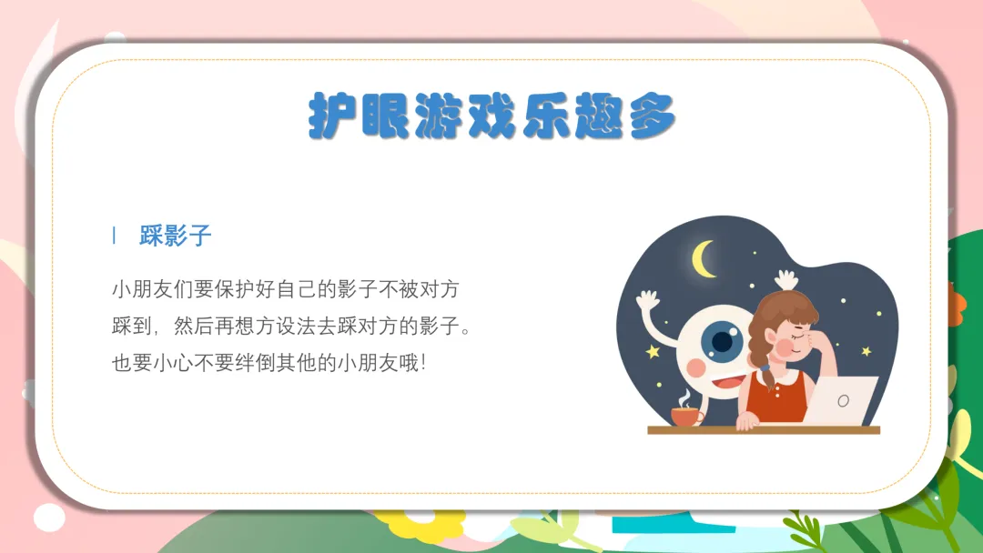 ✅ 踩影子游戏:在教室空地或户外开展,让娃保护自己的影子不被小伙伴踩到,同时去踩别人的影子,跑跳过程中眼睛灵活转动,既能护眼,又能锻炼身体。