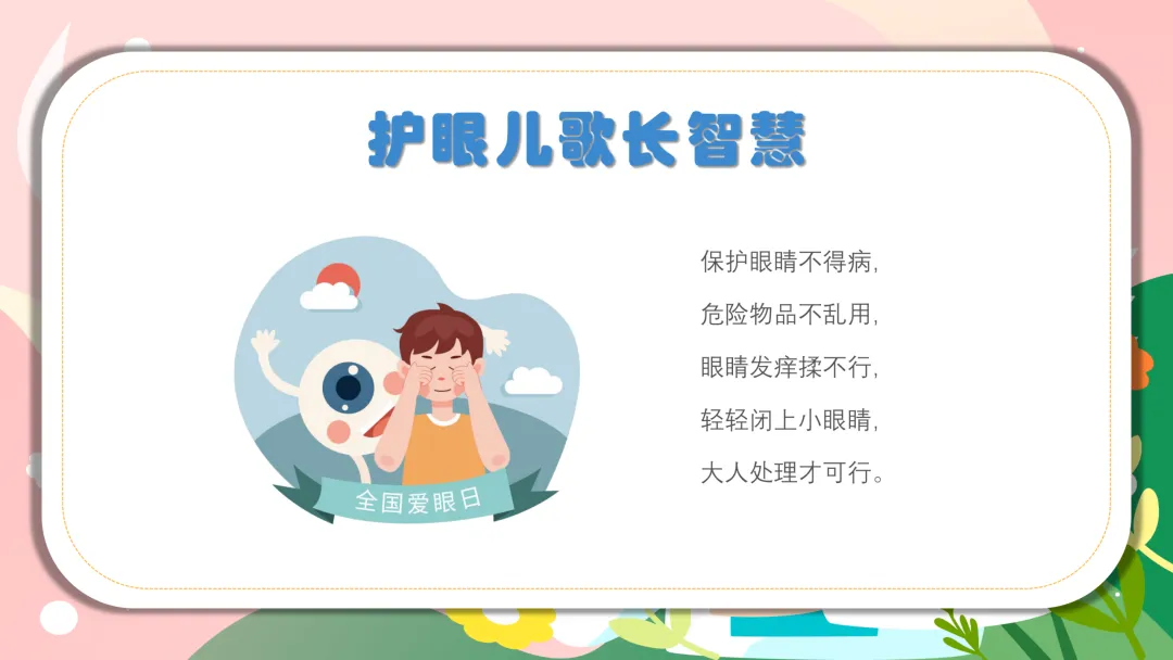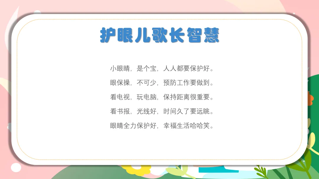 ✨ 进阶版儿歌:小眼睛,是个宝,人人都要保护好。眼保操,不可少,预防工作要做到。看电视,玩电脑,保持距离很重要。看书报,光线好,时间久了要远眺。