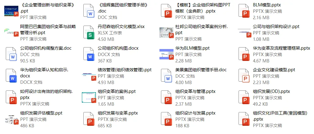 《OD组织发展组织变革资料包》,共24套相关资料,包含组织结构调整方案、组织变革管理务实、组织管理变革等等。部分资料展示如下: