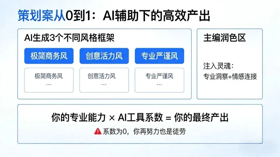 1.会议神器:别再苦逼地记纪要了。用AI语音工具实时转录,会后一键生成“待办事项+责任分配”,准确率99%,还能自动追踪进度。2.数据清洗:面对几千行的烂表格,别一个个改。把规则告诉AI Agent,让它自动清洗、分类、甚至预测趋势。以前搞一天,现在喝杯咖啡的功夫就完了。3.方案初稿:写策划案最头疼的是“从0到1”。让AI基于过往案例生成3个不同风格的框架,你只需要做“主编”,负责润色和注入灵魂。未来的职场公式是:你的专业能力 × AI工具系数 = 你的最终产出。系数为0,你再努力也是徒劳。