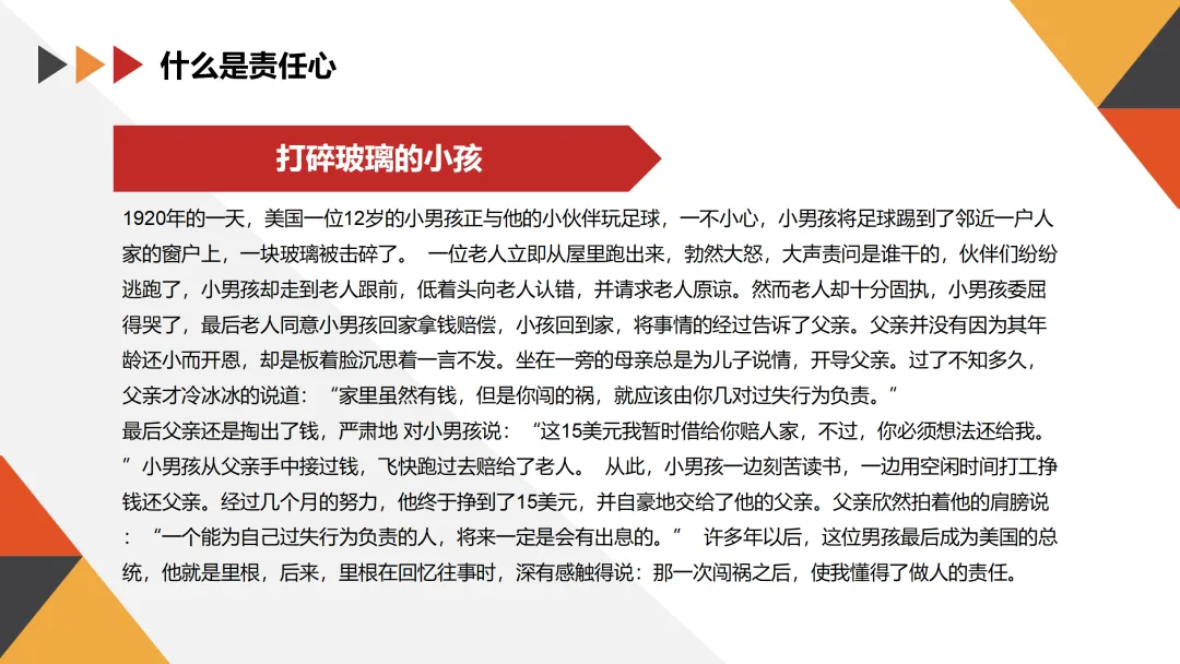 1920年的一天,美国一位12岁的小男孩在与小伙伴玩足球时,不小心将足球踢到了邻近一户人家的窗户上,击碎了一块玻璃。面对老人的责问,小男孩没有逃避,而是主动承认错误并请求原谅。在父亲的引导下,小男孩通过打工挣钱赔偿了玻璃费用。多年后,这位男孩成为了美国的总统——里根。他在回忆往事时深有感触地说:“那一次闯祸之后,使我懂得了做人的责任。”