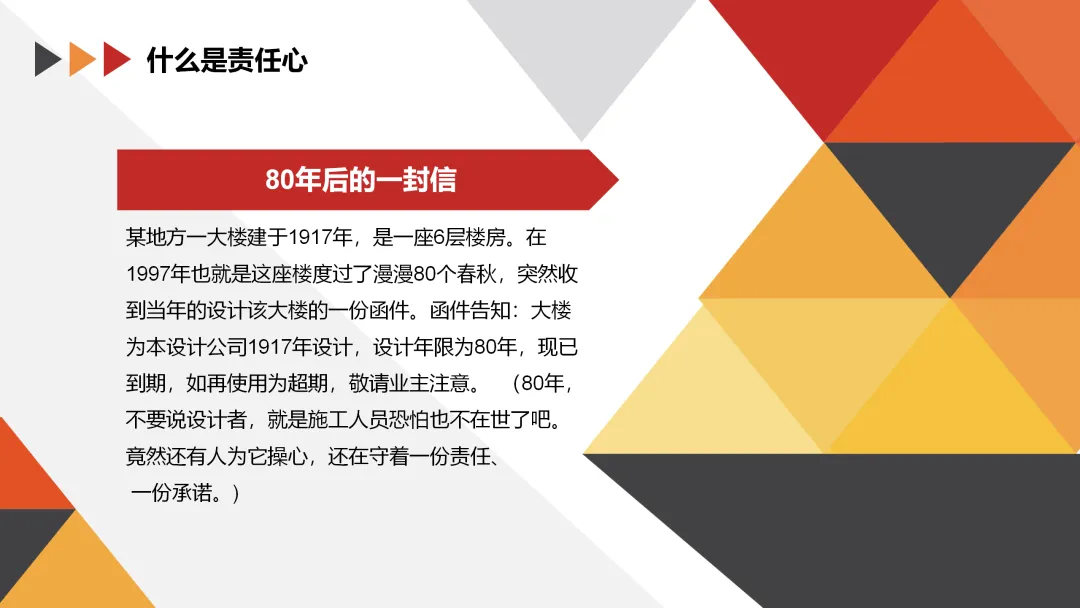 某地方一大楼建于1917年,是一座6层楼房。在1997年,也就是这座楼度过了漫漫80个春秋后,突然收到了当年设计该大楼的一份函件。函件告知:大楼为本设计公司1917年设计,设计年限为80年,现已到期,如再使用为超期,敬请业主注意。80年,不要说设计者,就是施工人员恐怕也不在世了吧。然而,竟然还有人为它操心,还在守着一份责任、一份承诺。这封信不仅是对建筑质量的负责,更是对职业精神的坚守。