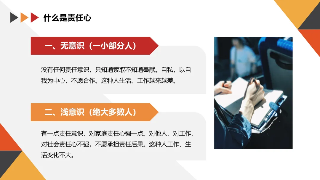 - 浅意识:有一点责任意识,但对家庭以外的责任不强,不愿承担责任后果。