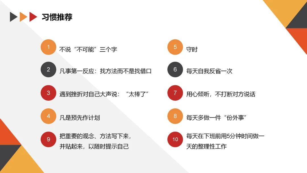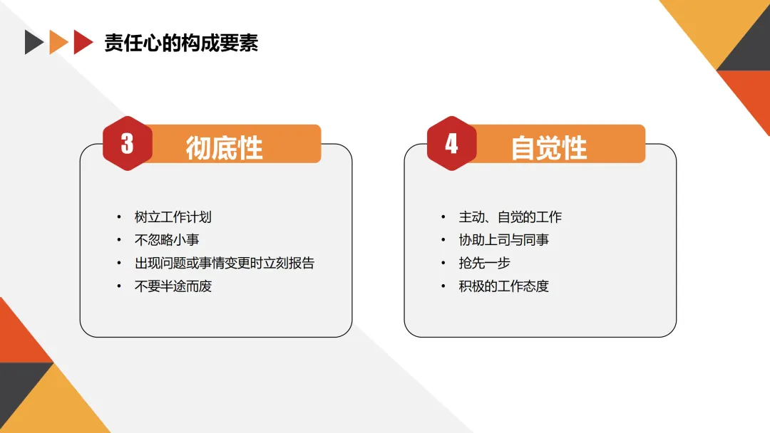 - 彻底性:树立工作计划,不忽略小事,出现问题或事情变更时立刻报告,不半途而废。