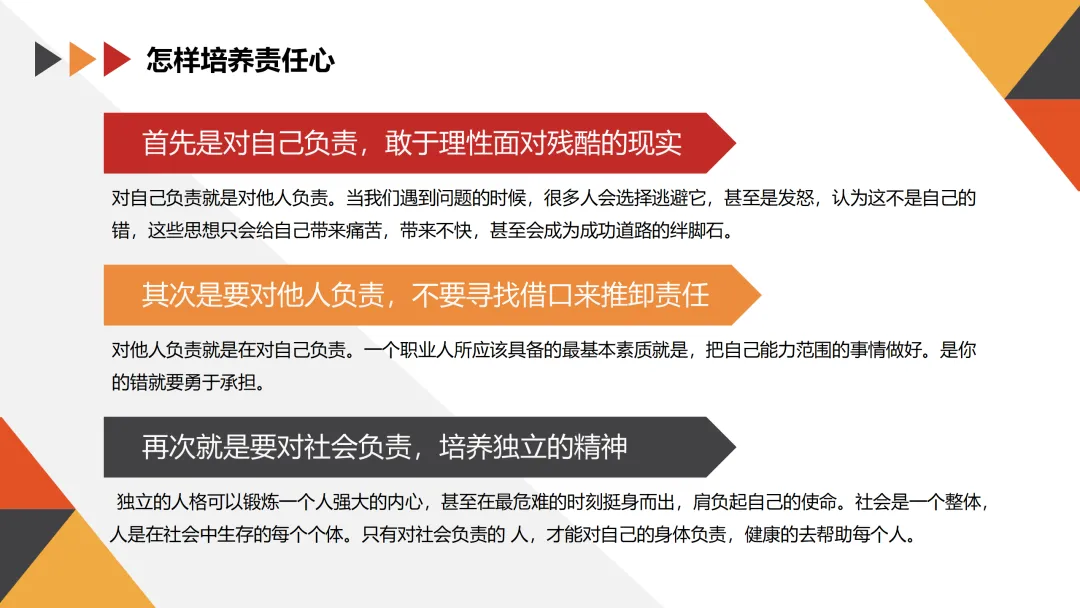 个人看法:对自己负责是培养责任心的起点。只有当我们能够正视自己的不足和错误,并勇于承担责任时,才能真正成长和进步。