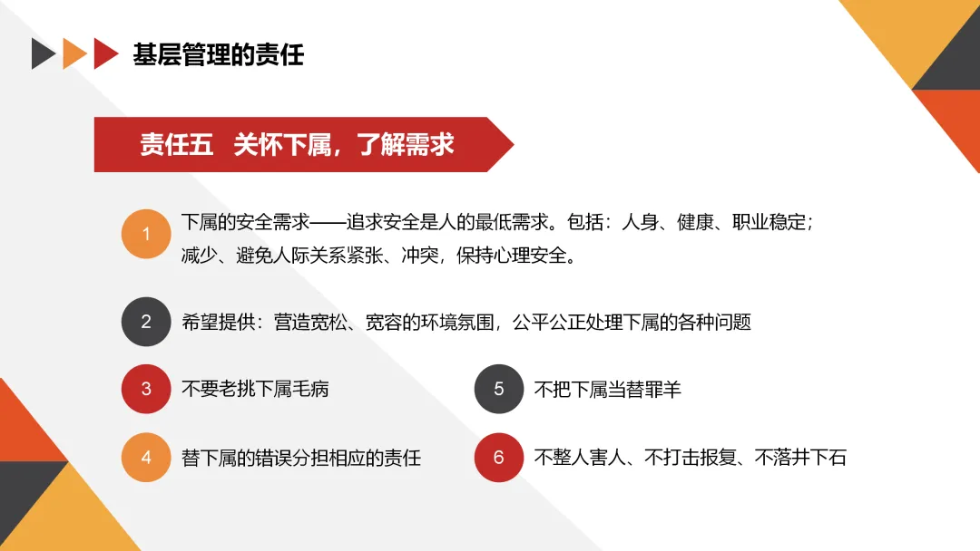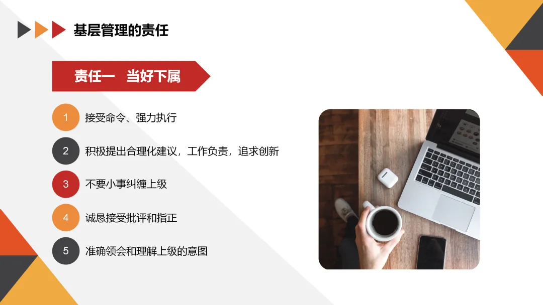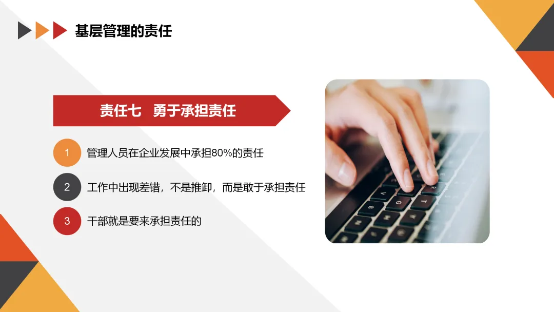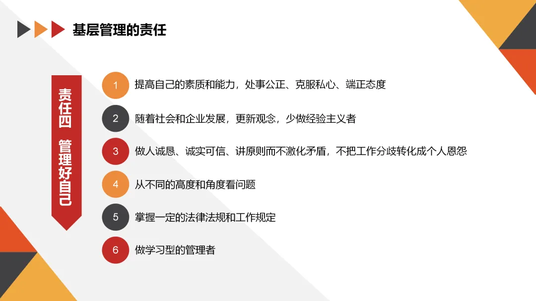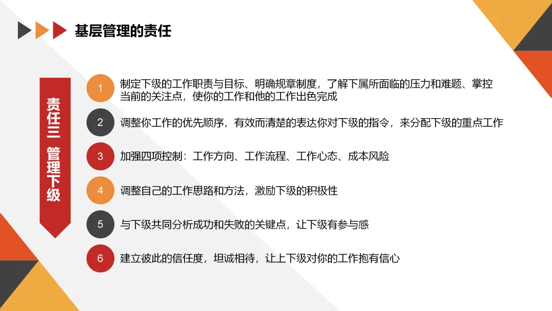 作为基层管理者,我们不仅要对自己负责,还要对团队和公司负责。以下是基层管理者应承担的几项主要责任: