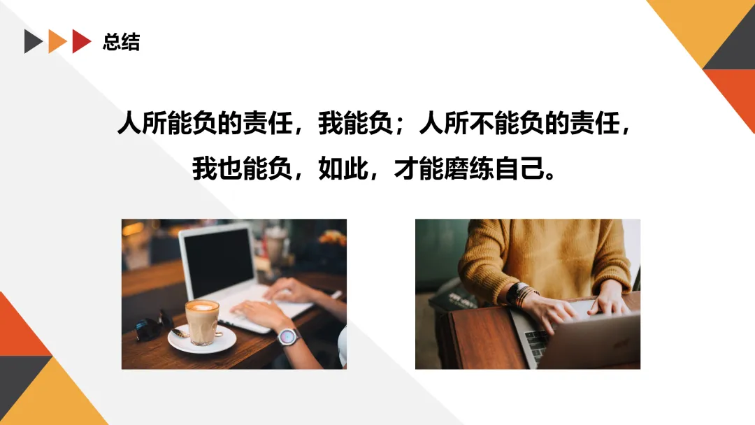 最后,我想用一句话来结束今天的培训:“人所能负的责任,我能负;人所不能负的责任,我也能负。如此,才能磨练自己,成就未来!”