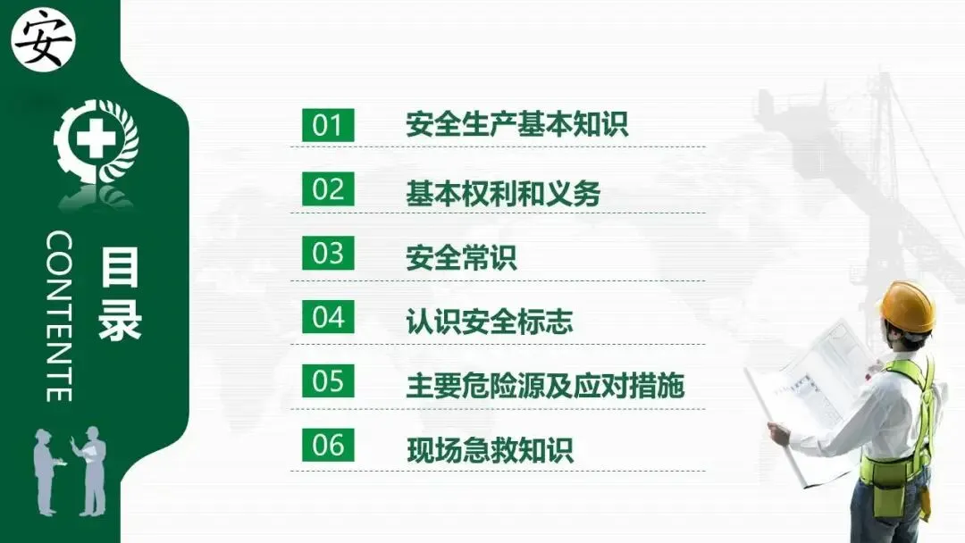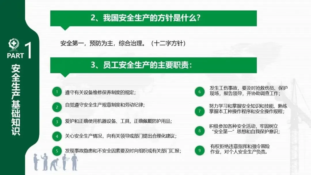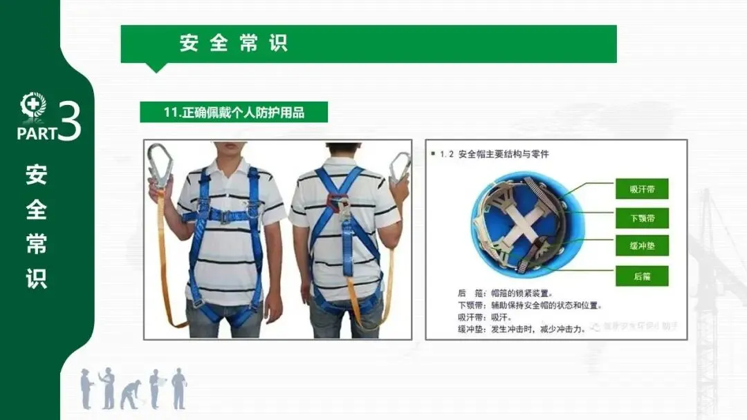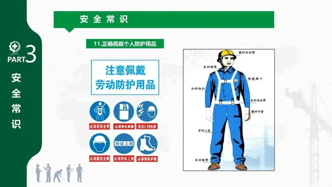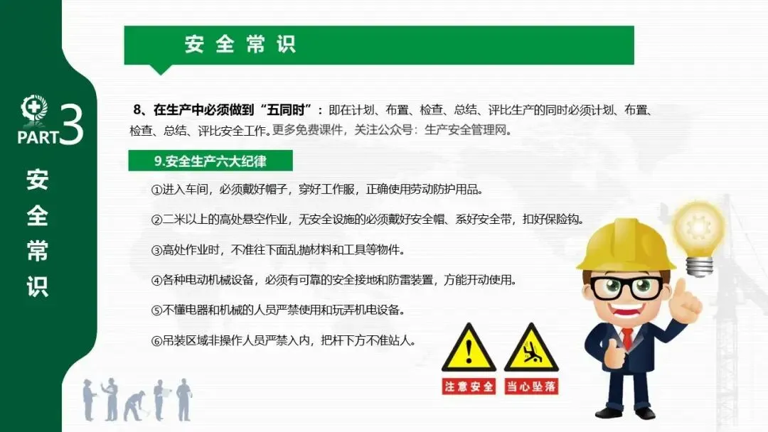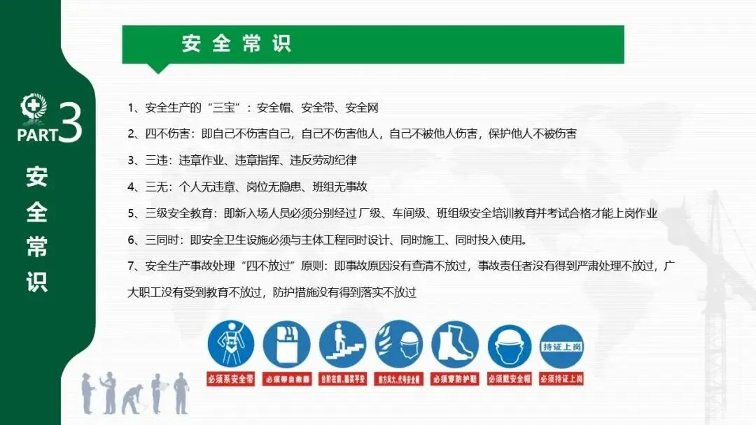 - 系统介绍了安全生产的“三宝”(安全帽、安全带、安全网)、“四不伤害”、“三违”(违章作业、指挥、劳动纪律)、“三无”等核心概念。