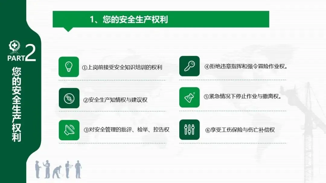 - 权利:包括接受安全培训、知情与建议、批评检举、拒绝违章指挥、紧急避险、享受工伤保险等六项。