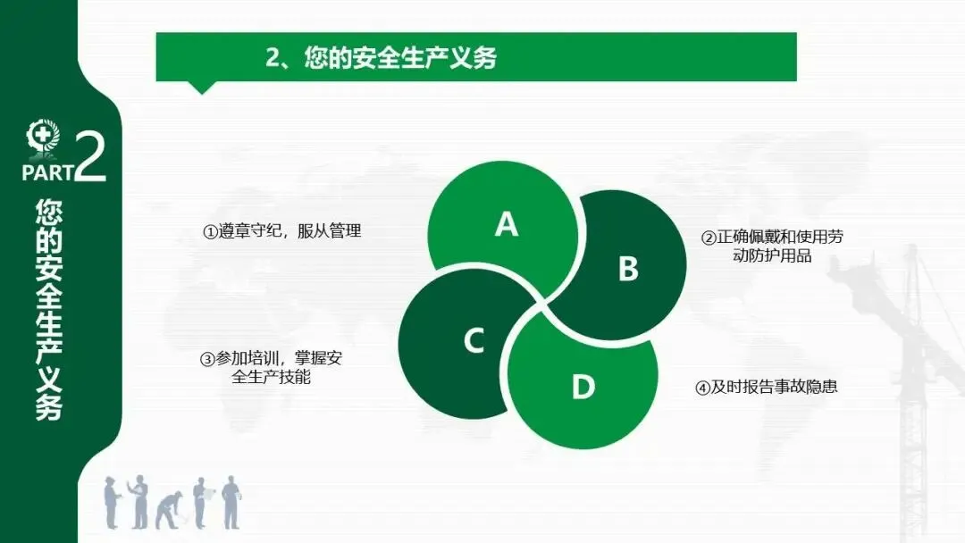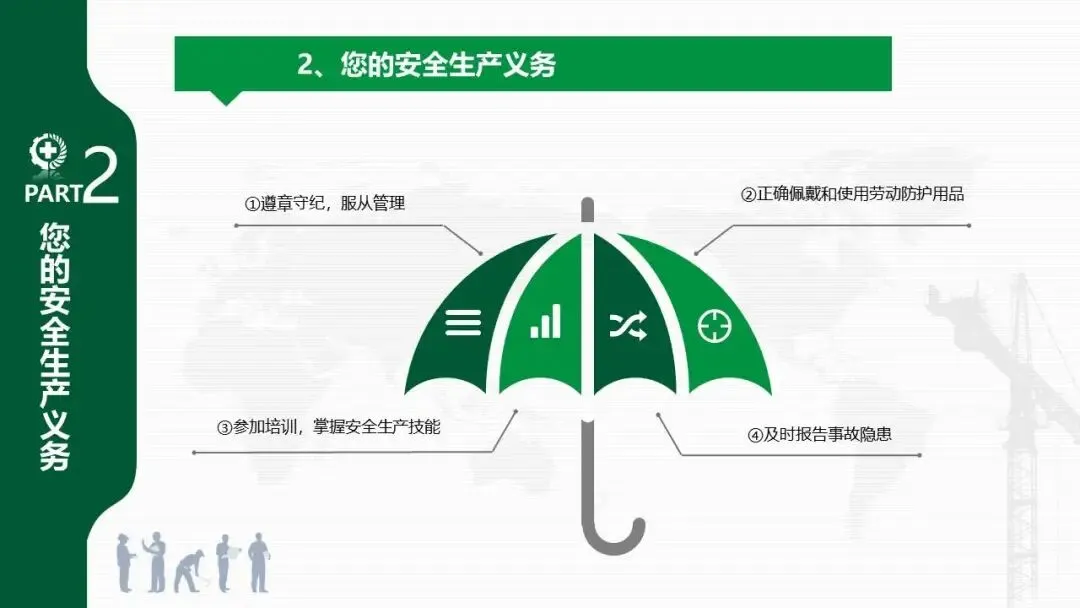 - 义务:包括遵章守纪、正确佩戴劳保用品、参加培训、及时报告事故隐患等四项。
