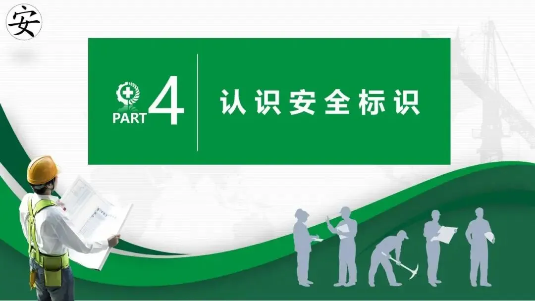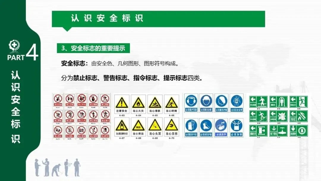 - 介绍了由安全色、几何图形和符号构成的四类安全标志:禁止、警告、指令、提示。